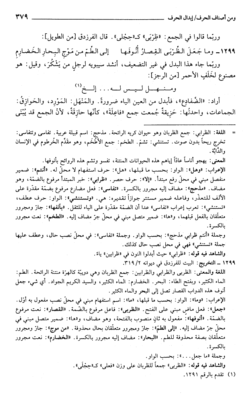 اللغة والمعنى: الظربى والظرابي والظرابين: جمع الظربان وهي دويبّة كالهرّة منتنة الرائحة. الطم: الماء الكثير، وبفتح الطاء: البحر. الخضارم: الماء الكثير، والسيد الكريم الجواد. أي شىء جعل أنوف هذه الدواب القصار تصل إلى البحر والماء الكثير.