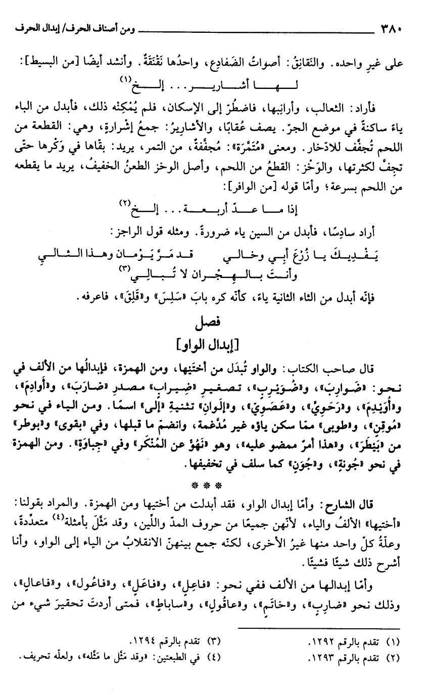 قال صاحب الكتاب: والواو تبدل من أختيها ومن الهمزة. فإبدالها من الألف في نحو ضوارب وضويرب تصغير ضيرات مصدر ضاربَ، وأوادم وأويدم ورحويَّ وعصويّ وإلوان تثنية "إلى" إسمًا. ومن الياء في نحو موقن وطوبى مما سكن ياؤه غير مدغمة وانضم ما قبلها، وفي بقوي وبوطر من بيطر، وهذا أمر ممضو عليه، وهو نهو عن المنكر وفي جباوة. ومن الهمزة في نحو جونة وجون كما سلف في تخفيفها.