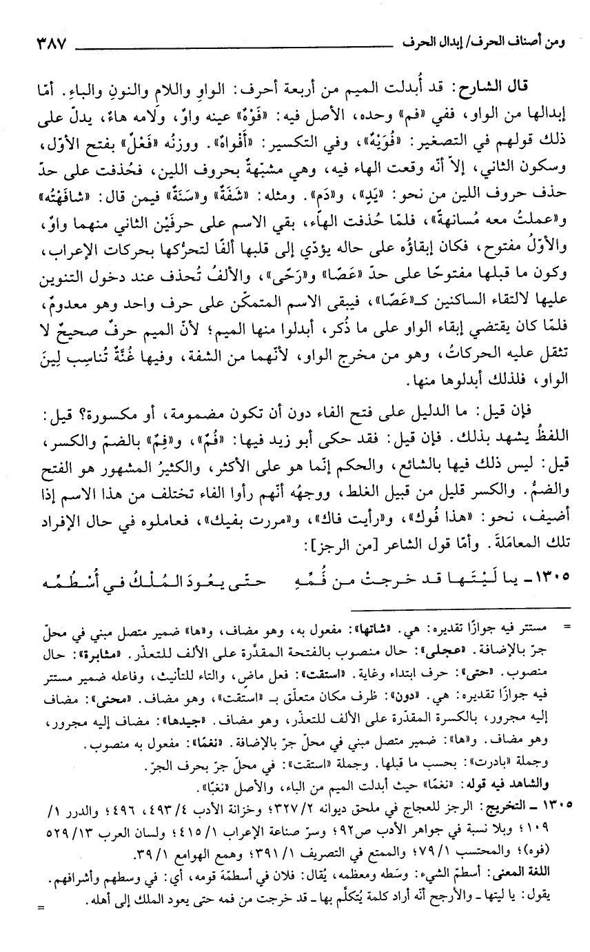 قال الشارح: قد أُبدلت الميم من أربعة أحرف: الواوِ واللام والنونِ والباءِ. أمّا إبدالها من الواو، ففي "فم" وحده، الأصل فيه: "فَوْهٌ" عينه واوٌ، وَلامه هاءٌ، يدل على ذلك قولهم في التصغير: "فُوَيْهٌ"، وفي التكسير: "أَفْواهٌ". ووزنُه "فَعْلٌ" بفتح الأوّل، وسكون الثاني، إلَّا أنه وقعت الهاء فيه، وهي مشبّهةٌ بحروف اللين، فحُذفت على حد حذف حروف اللين من نحو. "يَدٍ"، و"دَمٍ". ومثله: "شَفَةٌ" و"سَنَةٌ" فيمن قال: "شافَهْتُه" و"عملت معه مُسانهةً"، فلمّا حُذفت الهاء, بقي الاسم على حرفَيْن الثاني منهما واوٌ، والأوّلُ مفتوح، فكان إبقاؤُه على حاله يؤدّي إلى قلبها ألفًا لتحركها بحركات الإعراب، وكون ما قبلها مفتوحًا على حد "عَصًا" و"رَحًى"، والألفُ تحذف عند دخول التنوين عليها لالتقاء الساكنين كـ"عَصًا"، فيبقى الاسم المتمكّن على حرف واحد وهو معدومٌ، فلمّا كان يقتضى إبقاء الواو على ما ذُكر، أبدلوا منها الميم؛ لأنّ الميم حرفٌ صحيحٌ لا تثقل عليه الحركاتُ، وهو من مخرج الواو، لأنّهما من الشفة، وفيها غُنَّةٌ تُناسِب لِينَ الواو، فلذلك أبدلوها منها.