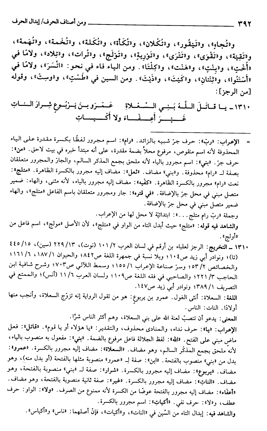 1310 - التخريج: الرجز لعلباء بن أرقم في لسان العرب 2/ 101 (نوت)، 13/ 229 (سين)، 15/ 445 (تا)؛ ونوادر أبي زيد ص 104؛ وبلا نسبة في جمهرة اللغة ص 842؛ والحيوان 1/ 187، 6/ 161؛ والخصائص 2/ 53؛ وسرّ صناعة الإعراب 1/ 155؛ وسمط اللآلي ص 703؛ وشرح شافية ابن الحاجب 3/ 221؛ والصاحبي في فقه اللغة ص 109؛ ولسان العرب 6/ 11 (أنس)؛ والممتع في التصريف 1/ 389؛ ونوادر أبي زيد ص 147.