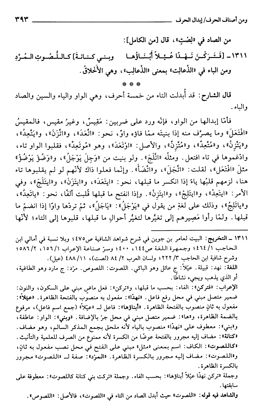 1311 - التخريج: البيت لعامر بن جوين في شرح شواهد الشافية ص 475؛ وبلا نسبة في أمالي ابن الحاجب 1/ 464؛ وجمهرة اللغة ص 144، 400؛ وسرّ صناعة الإعراب 1/ 156، 2/ 586؛ وشرح شافية ابن الحاجب 3/ 222؛ ولسان العرب 2/ 84 (لصت)، 11/ 488 (عيل).