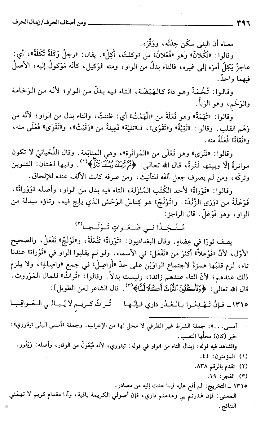 يصف ثورًا في عِضاهٍ. وقال البغداديون: "تَوْراةٌ" تَقعَلَةُ، و"تَوْلَجٌ" تَفعَلُ، والصحيح الأول, لأنّ "فَوْعلًا" أكثرُ من "تَفْعَل" في الأسماء، ولو لم يقلبوا الواو في "تَوْراة" عندنا تاء، لزم قلبُها همزة لاجتماع الواوَيْن على حدّ "أَواصِلَ" في جمع "واصِلةٍ"، ولا يلزم ذلك عندهم؛ لأنّ التاء عندهم زائدة، وليست بدلًا. وقالوا: "تُراثٌ" للمال المَوْروث. قال الله تعالى: {وَتَأْكُلُونَ التُّرَاثَ أَكْلًا لَمًّا} (¬3). قال الشاعر [من الطويل]: