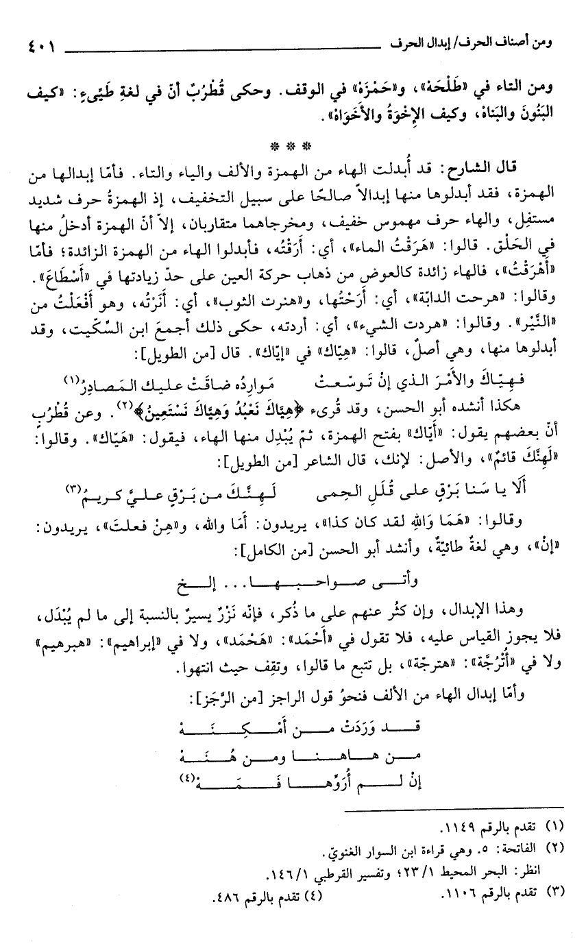 قال الشارح: قد أُبدلت الهاء من الهمزة والألف والياء والتاء. فأمّا إبدالها من الهمزة، فقد أبدلوها منها إبدالًا صالحًا على سبيل التخفيف، إذ الهمزةُ حرف شديد مستفِل، والهاء حرف مهموس خفيف، ومخرجاهما متقاربان، إلَّا أنّ الهمزة أدخلُ منها فيِ الحَلْق. قالوا: "هَرَقْتُ الماء"، أي: أَرَقْتُه، فأبدلوا الهاء من الهمزة الزائدة؛ فأمّا "أَهْرَقْت"، فالهاء زائدة كالعوض من ذهاب حركة العين على حدّ زيادتها في "اسْطَاعَ". وقالوا: "هرحت الدابّة", أي: أَرَحْتها, و"هنرت الثوب"، أي: أَنَرْتُه، وهو أَفْعَلْتُ من "النَّيْر". وهالوا: "هردت الْشيء"، أى: أردته، حكى ذلك أجمعَ ابن السِّكّيت، وقد أبدلوها منها، وهي أصل، قالوا: "هِيّاك" في "إياّك". قال [من الطويل]: