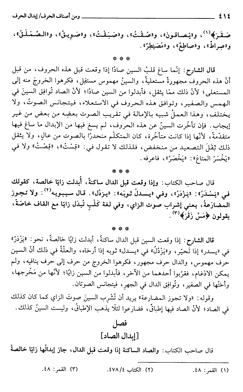 قال الشارح: إنّما ساغ قلبُ السين صادًا إذا وقعت قبل هذه الحروف، من قبل أنّ هذه الحروف مجهورةٌ مستعلية، والسينُ مهموس مستفِل، فكرهوا الخروجَ منه إلى المستعلى؛ لأنّ ذلك ممّا يثقل، فأبدلوا من السين صادًا؛ لأنّ الصاد تُوافِق السينَ في الهمس والصفير، وتوافق هذه الحروف في الاستعلاء، فيتجانس الصوت، ولا يختلف، وهذا العملُ شبيه بالإمالة في تقريب الصوت بعضِه من بعض من غير إيجاب. فإن تأخّرت السينُ عن هذه الحروف، لم يسغ فيها من الإبدال ما ساغ فيها متقدّمة, لأنّها إذا كانت متأخرة، كان المتكلّم منحدرًا بالصوت من عالٍ، ولا يثقل ذلك ثِقَلَ التصعيد من منخفض، فلذلك لا تقول في. "قِسْتُ"، "قِصْتُ" ولا في "يَخسَرُ المتاعَ": "يَخْصَرُ"، فاعرفه.
