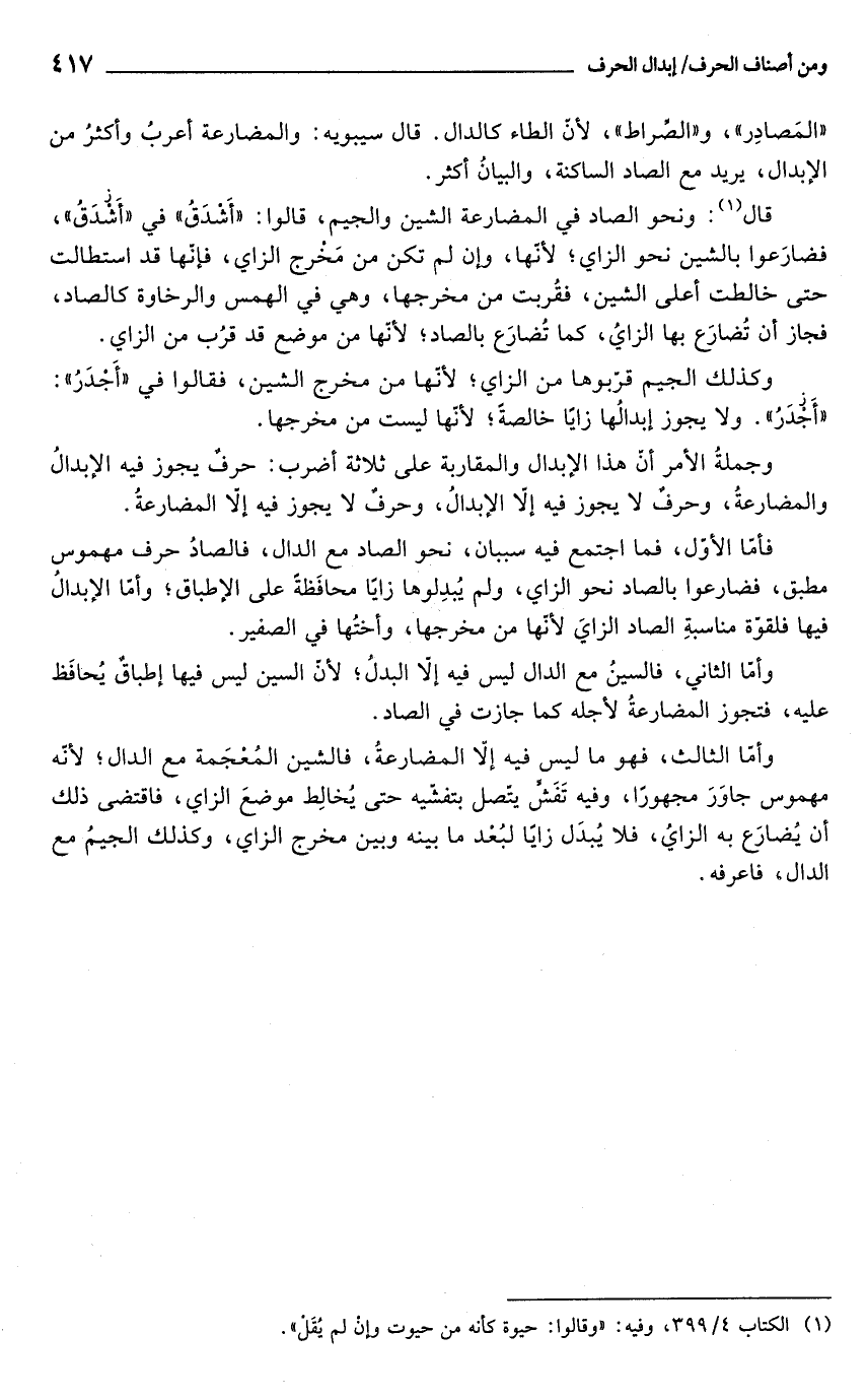 "المَصادِر"، و"الصِّراط", لأنّ الطاء كالدال. قال سيبويه: والمضارعة أعربُ وأكثرُ من الإبدال، يريد مع الصاد الساكنة، والبيانُ أكثر.