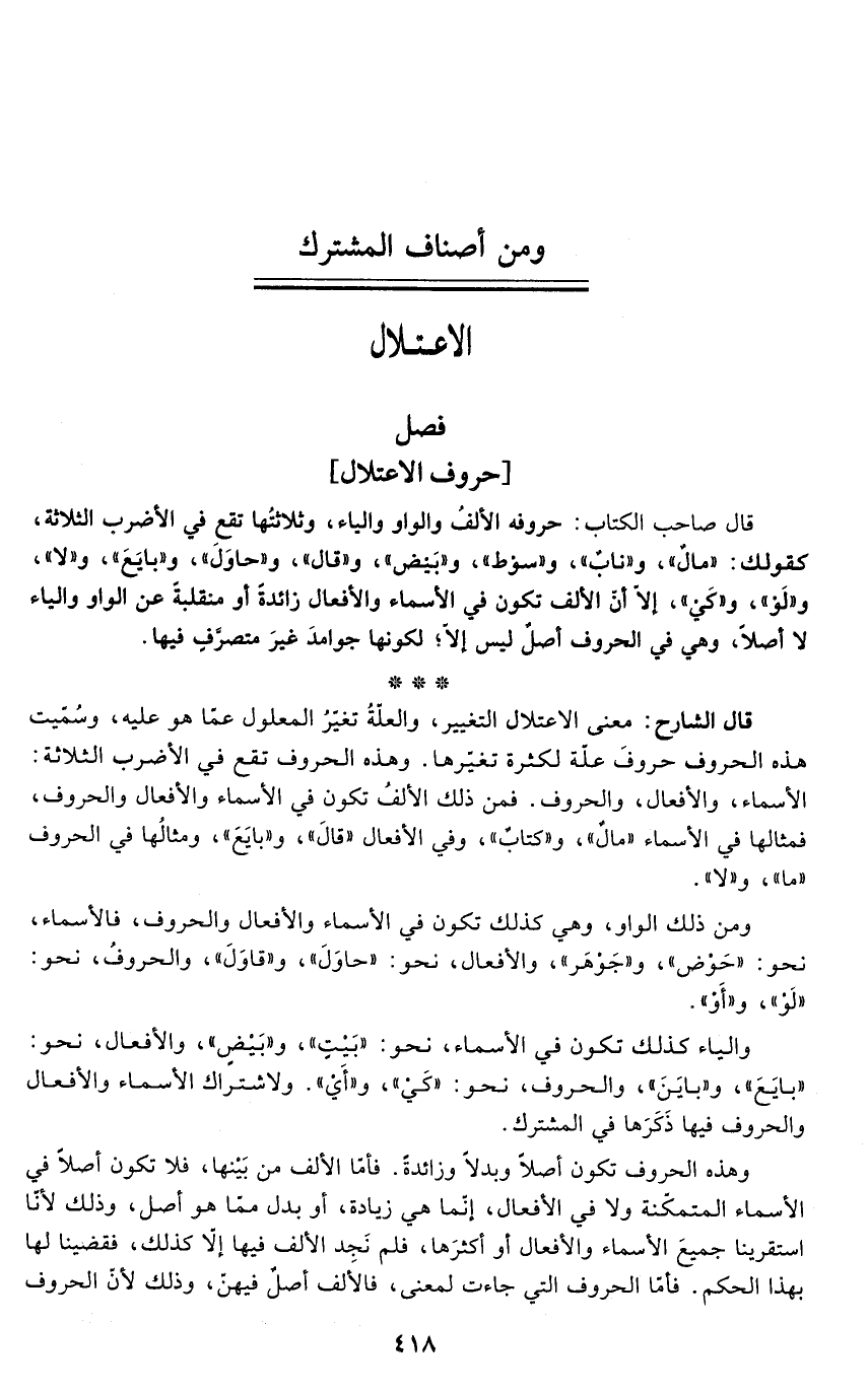 قال الشارح: معنى الاعتلال التغيير، والعلّةُ تغيرُ المعلول عمّا هو عليه، وسُمّيت هذه الحروف حروفَ علّة لكثرة تغيّرها. وهذه الحروف تقع في الأضرب الثلاثة: الأسماء، والأفعال، والحروف. فمن ذلك الألفُ تكون في الأسماء والأفعال والحروف، فمثالها في الأسماء "مالٌ"، و"كتابٌ"، وفي الأفعال "قالَ"، و"بايَعَ"، ومثالُها في الحروف "ما"، و"لا".