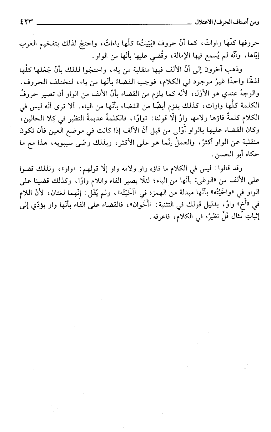 وذهب آخرون إلى أن الألف فيها منقلبة من ياء، واحتجّوا لذلك بأنّ جَعْلها كلِّها لفظًا واحدًا غيرُ موجود في الكلام، فوجب القضاءُ بأنّها من ياء، لتختلف الحروف. والوجهُ عندي هو الأول, لأنّه كما يلزم من القضاء بأن الألف من الواو أن تصير حروفُ الكلمة كلُّها واوات، كذلك يلزم أيضًا من القضاء بأنّها من الياء. ألا ترى أنّه ليس في الكلام كلمةٌ فاؤها ولامها واوٌ إلَّا قولنا: "واوٌ"، فالكلمةُ عديمةُ النظير في كِلا الحالين، وكان القضاء عليها بالواو أَوْلى من قبل أن الألف إذا كانت في موضع العين فأن تكون منقلبة عن الواو أكثرُ، والعملُ إنّما هو على الأكثر، وبذلك وصّى سيبويه، هذا مع ما حكاه أبو الحسن.
