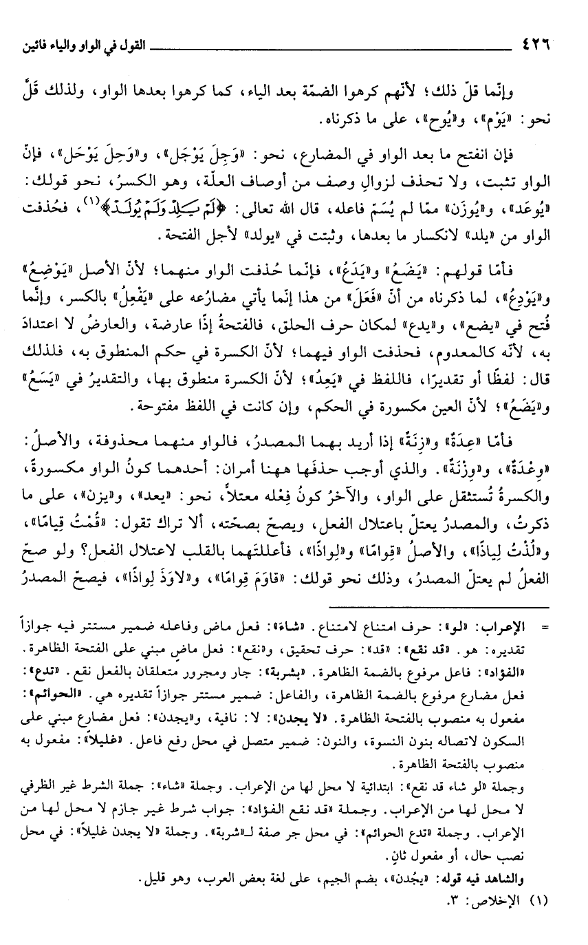 وإنّما قل ذلك؛ لأنّهم كرهوا الضمّة بعد الياء، كما كرهوا بعدها الواو، ولذلك قَلَّ نحو: "يَوْم"، و"يُوح"، على ما ذكرناه.