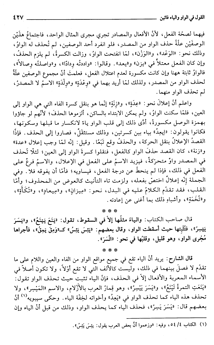 قال الشارح: يريد أن الياء تقع في جميع مواقع الواو من الفاء والعين واللام على ما تقدّم لا فصلَ بينهما في ذلك، وليست كالألف التي لا تقع أوّلًا، ولا تكون أصلًا في الأسماء المعربة والأفعال إلَّا في الحذف، فإن الياء تثبت حيث تحذف الواو تقول: "يَنَعَتِ التمرةُ تَيْنَعُ"، و"يَسَرَ يَيْسِرُ"، وهو قِمارُ العرب بالأزْلام، والاسم "المَيْسِر"، ولا تحذف هذه الياء كما تحذف الواو في "يَعِدُ" وأخواته لخِفّة الياء. وحكى سيبويه (¬1) أنّ بعضهم قال" "يَسَرَ يَسِرَ"، فحذف الياء كما يحذف الواو، وذلك من قبل أن الياء وإن
