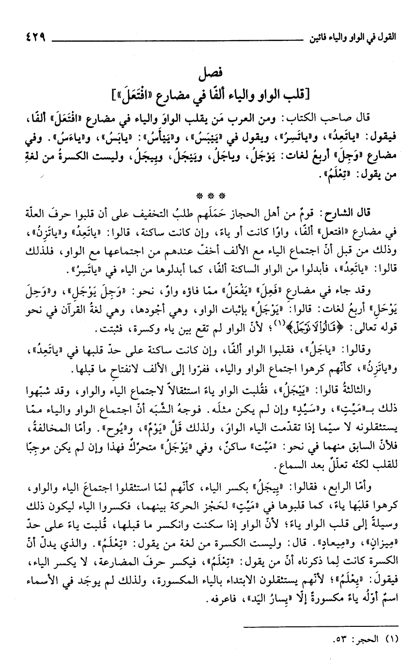 قال صاحب الكتاب: ومن العرب من يقلب الواو والياء في مضارع "افتعل" ألفًا, فيقول: "ياتعدُ" و"ياتَسِرُ"، ويقول في ييبسُ وييأس: يابس وياءس. وفي مضارع "وَجِلَ" أربع لغات: يوجل وياجل وييجل وييجل, وليست الكسرة من لغة من يقول: "تِعْلَمُ".