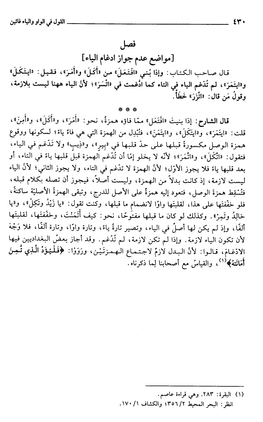 قال الشارح: إذا بنيتَ "افْتَعَل" مما فاؤهَ همزة، نحو: "أَمَرَ"، و"أَكَلَ"، و"أَمِنَ"، قلت: "ايتَمَرَ"، و"ايتَكَلَ"، و"ايتَمَنَ"، فتُبْدِل من الهمزة التي هي فاءٌ ياءً؛ لسكونها ووقوع همزة الوصل مكسورة قبلها على حدّ قلبها في "بِيرٍ"، و"ذِيبٍ" ولا تَدْغم في الياء، فتقول: "اتَّكَلَ"، و"اتَّمَرَ"؛ لأنّه لا يخلو إمّا أن تدْغم الهمزة قبل قلبها ياءً في التاء، أو بعد قلبها ياءً فلا يجوز الأوّل؛ لأنّ الهمزة لا تدْغم في التاء، ولا يجوز الثاني؛ لأنّ الياء ليست لازمة، إذ كانت بدلًا من الهمزة، وليست أصلاً، فيجوز أن تصله بكلام قبله، فتُسقِط همزةَ الوصل، فتعود إليه همزةٌ على الأصل للدرج، وتبقى الهمزة الأصليّة ساكنة، فلو خقفتَها على هذا، لقلبتَها واوًا لانضمامِ ما قبلها، وكنت تقول: "يا زَيْدُ وتَكِلْ"، و"يا خالِدُ وتَمِرْ". وكذلك لو كان ما قبلها مفتوحًا، نحو: كيف أتَمَنْتَ، وخفّفتَها, لقلبتَها ألفًا، وإذ لم يكن لها أصلٌ في الياء، وتصير تارة ياء، وتارة واوًا، وتارة ألفًا، فلا وَجْهَ لأنّ تكون الياء لازمة. وإذا لم تكن لازمة، لم تُدّغم. وقد أجاز بعضُ البغداديين فيها الادّغامَ، قالوا: لأنّ البدل لازمٌ لاجتماع الهمزتَين، ورَوَوْا: {فَلْيُؤَدِّ الَّذِي اؤْتُمِنَ أَمَانَتَهُ} (¬1)، والقياسُ مع أصحابنا لِما ذكرناه.