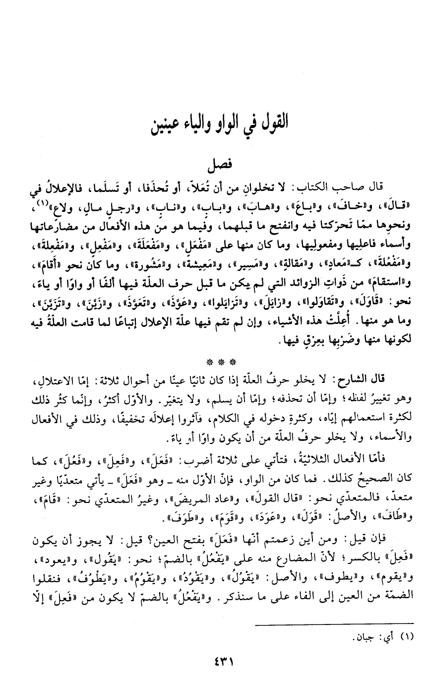 فإن قيل: ومن أين زعمتم أنها "فَعَلَ" بفتح العين؟ قيل: لا يجوز أن يكون "فَعِلَ" بالكسر؛ لأنّ المضارع منه على "يَفْعُلُ" بالضمّ؛ نحو: "يَقُول"، و"يعود"، و"يقوم"، و"يطوف"، والأصل: "يَقْوُلُ"، و"يَقْوُدُ"، و"يَقوُمُ"، و"يَطْوُفُ"، فنقلو االضمّة من العين إلى الفاء على ما سنذكر. و"يَفْعُلُ" بالضمّ لا يكون من "فَعِلَ" إلَّا