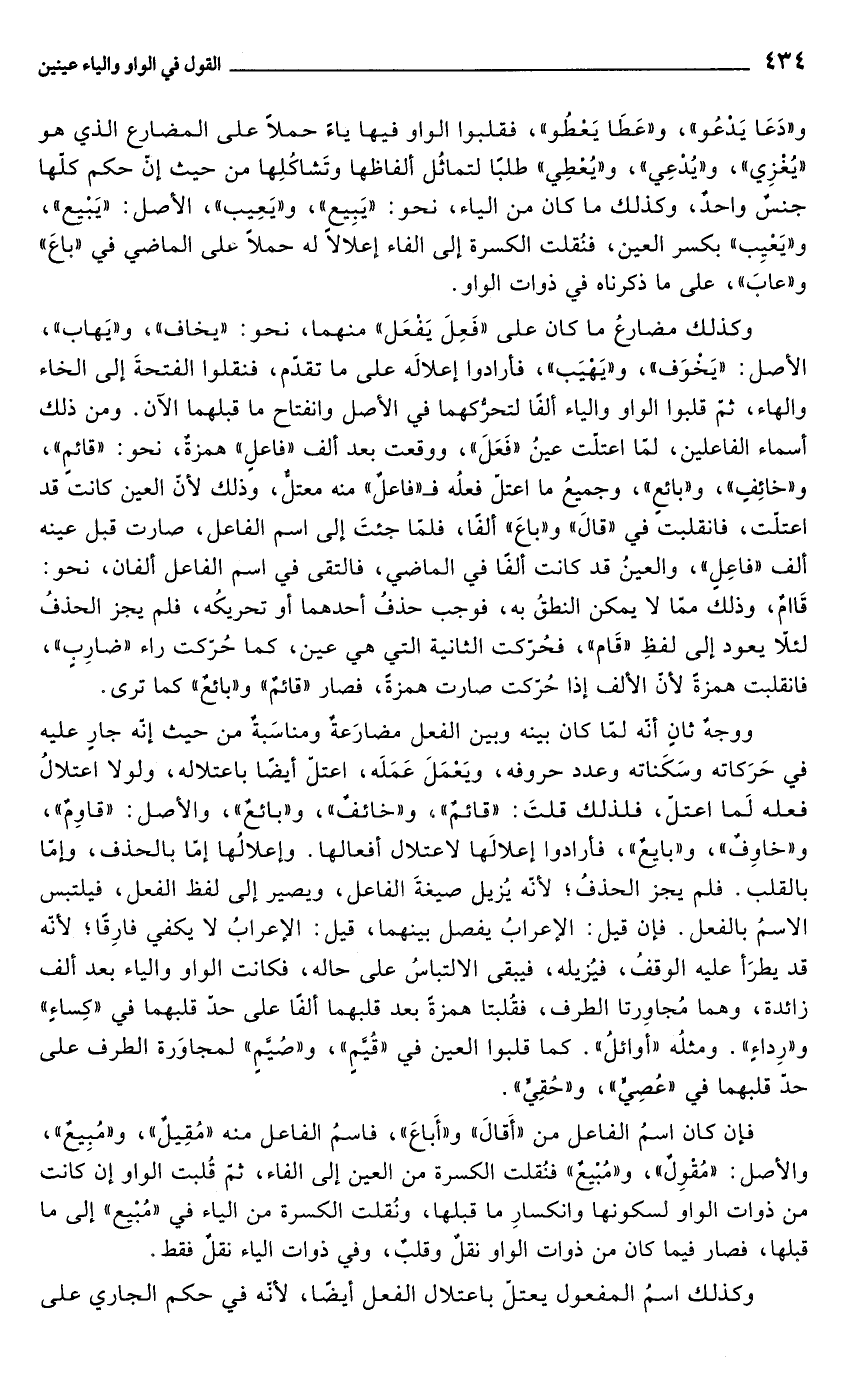 وكذلك مضارعُ ما كان على "فَعِلَ يَفْعَل" منهما، نحو: "يخاف", و"يَهاب"، الأصل: "يَخوَف"، و"يَهْيَب"، فأرادوا إعلالَه على ما تقدّم، فنقلوا الفتحةَ إلى الخاء والهاء، ثمّ قلبوا الواو والياء ألفًا لتحرّكهما في الأصل وانفتاح ما قبلهما الآن. ومن ذلك أسماء الفاعلين، لما اعتلّت عينُ "فَعَلَ"، ووقعت بعد ألف "فاعل" همزة، نحو: "قائمٍ"، و"خائِفٍ"، و"بائعٍ"، وجميعُ ما اعتل فعلُه فـ "فاعلٌ" منه معتل، وذلك لأنّ العين كانت قد اعتلّت، فانقلبت في "قالَ" و"باعَ" ألفًا، فلمّا جئتَ إلى اسم الفاعل، صارت قبل عينه ألف "فاعِلٍ"، والعينُ قد كانت ألفًا في الماضي، فالتقى في اسم الفاعل ألفان، نحو: قَااامٌ، وذلك ممّا لا يمكن النطقُ به، فوجب حذفُ أحدهما أو تحريكُه، فلم يجز الحذفُ لئلّا يعود إلى لفظِ "قَام"، فحُرّكت الثانية التي هي عين، كما حُرّكت راء "ضارِب"، فانقلبت همزة لأنّ الألف إذا حُرّكت صارت همزةً، فصار "قائمٌ" و"بائعٌ" كما ترى.