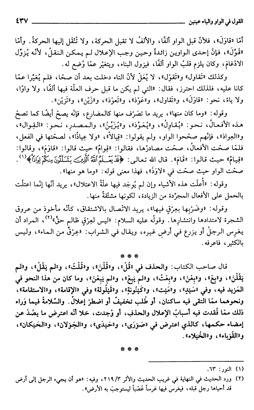 قال صاحب الكتاب: والحذف في قُلْ وقُلْنَ وقلت ولم يقل, ولم يقلن وبع وبعن وبعت ولم يبع ولم يبعن، وما كان من هذا النحو في المزيد فيه، وفي سيد وميت، وكينونة وقيلولة، وفي الإقامة والاستقامة ونحوها مما التقى فيه ساكنان أو طلب تخفيف أو اضطر إعلال. والسلامة فيما وراء ذلك مما فقدت فيه أسباب الإعلال والحذف أو وجدت خلا أنه اعترض ما يصد عن حكمها كالذي اعترض في صورى وحيدي والجولان والحيكان والقوباء والخيلاء.