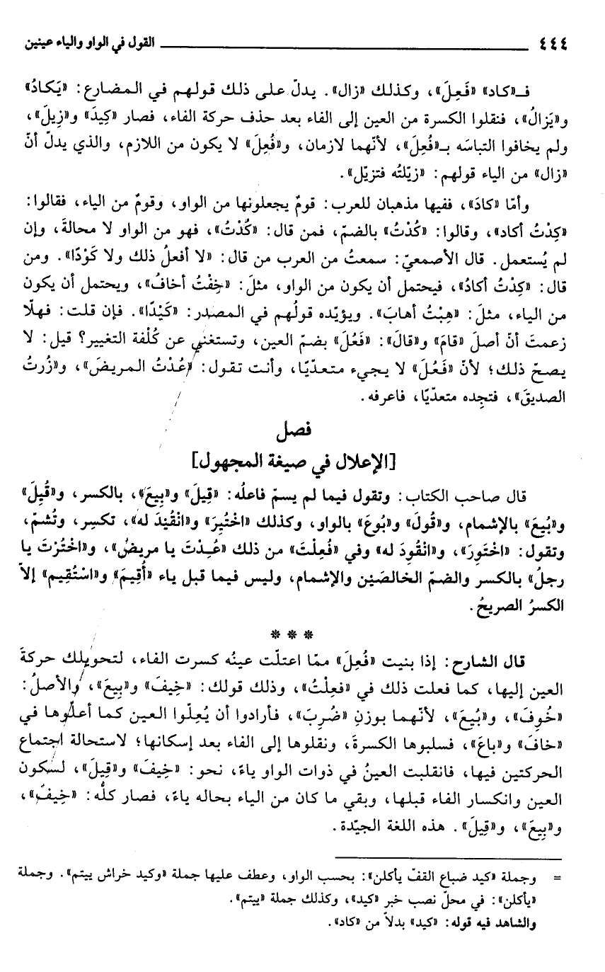 وأمّا "كادَ"، ففيها مذهبان للعرب: قومٌ يجعلونها من الواو، وقومٌ من الياء، فقالوا: "كِدْتُ أكاد"، وقالوا: "كُدْتُ" بالضمّ، فمن قال: "كُدْتُ"، فهو من الواو لا محالةَ، وإن لم يُستعمل. قال الأصمعي: سمعتُ من العرب من قال: "لا أفعلُ ذلك ولا كَوْدًا". ومن قال: "كِدْتُ أكادُ"، فيحتمل أن يكون من الواو، مثلَ: "خِفْتُ أخافُ"، ويحتمل أن يكون من الياء، مثلَ: "هِبْتُ أهابَ". ويؤيّده قولُهم في المصدر: "كَيدًا". فإن قلت: فهلّا زعمتَ أنّ أصلَ "قامَ" و"قالَ": "فَعُلَ" بضمّ العين، وتستغنى عن كُلْفة التغيير؟ قيل: لا يصحّ ذلك؛ لأنّ "فَعُلَ" لا يجيء متعدّيًا، وأنت تقول: "عُدْتُ المريضَ"، و"زُرتُ الصديقَ"، فتجِده متعدّيًا، فاعرفه.