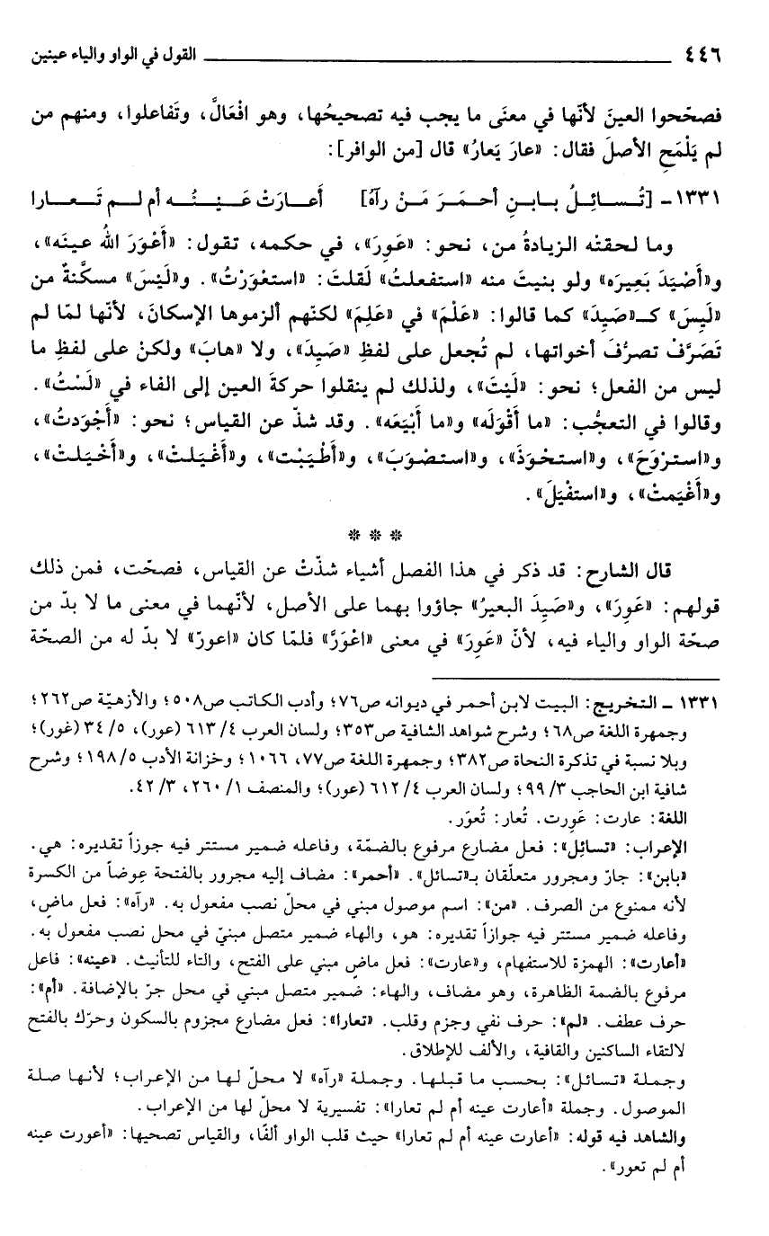 والشاهد فيه قوله: "أعارت عينه أم لم تعارا" حث قلب الواو ألفًا، والقياس تصحيها: "أعورت عينه أم لم تعور".