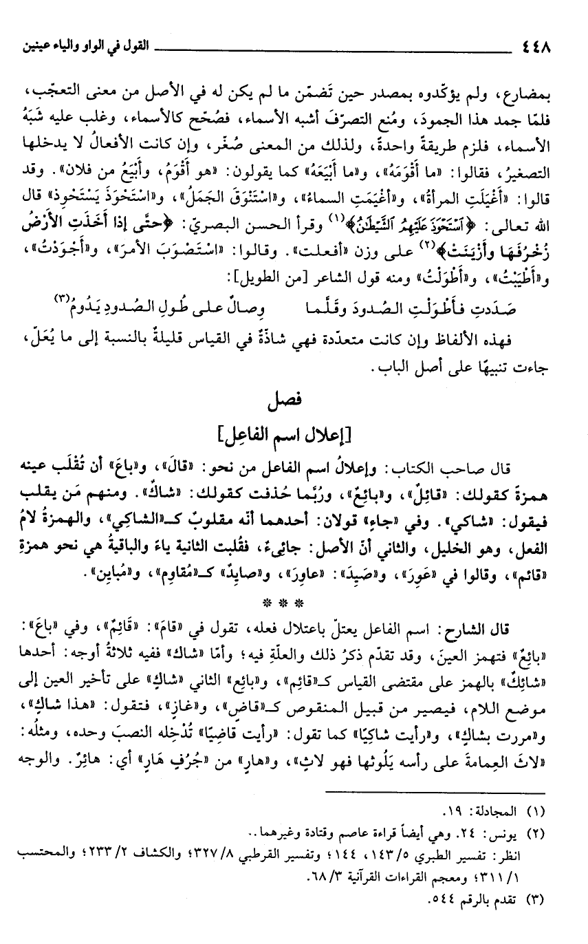 قال الشارح: اسم الفاعل يعتلّ باعتلال فعله، تقول في "قامَ": "قَائِمٌ"، وفي "باعَ": "بائِعٌ" فتهمز العينَ، وقد تقدّم ذكرُ ذلك والعلّةِ فيه؛ وأمّا "شاك" ففيه ثلاثةُ أوجه: أحدها "شائِكٌ" بالهمز على مقتضى القياس كـ"قائِم"، و"بائِع" الثاني "شاكٍ" على تأخير العين إلى موضع اللام، فيصير من قبيل المنقوص كـ"قاضٍ"، و"غازٍ"، فتقول: "هذا شاكٍ"، و"مررت بشاكٍ"، و"رأيت شاكِيًا" كما تقول: "رأيت قاضِيًا" تُدْخِله النصبَ وحده، ومثلُه: "لاثَ العِمامةَ على رأسه يَلُوثها فهو لاثٍ"، و"هارٍ" من "جُرُفٍ هَارٍ" أي: هائِرٌ. والوجه