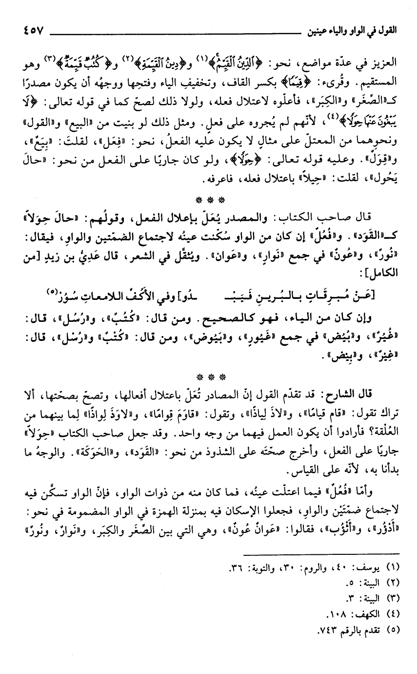 العزيز في عدّة مواضع، نحو. {الدِّينُ الْقَيِّمُ} (¬1) و {دِينُ الْقَيِّمَةِ} (¬2) و {كُتُبٌ قَيِّمَةٌ} (¬3) وهو المستقيم. وقُرىء: {قِيَمًا} بكسر القاف، وتخفيفِ الياء وفتحِها ووجهُه أن يكون مصدرًا كـ"الصغَر" و"الكِبَر"، فأعلّوه لاعتلال فعله، ولولا ذلك لصحّ كما في قوله تعالى: {لَا يَبْغُونَ عَنْهَا حِوَلًا} (¬4)، لأنّهم لم يُجروه على فعلٍ. ومثل ذلك لو بنيت من "البيع" و"القول" ونحوِهما من المعتلّ على مثالِ لا يكون عليه الفعلُ، نحو: "فِعَل"، لقلتَ: "بِيَعٌ"، و"قِوَلٌ". وعليه قوله تعالى: {حِوَلًا}، ولو كان جاريًا على الفعل من نحو: "حالَ يَحُول"، لقلت: "حِيلًا" باعتلال فعله، فاعرفه.