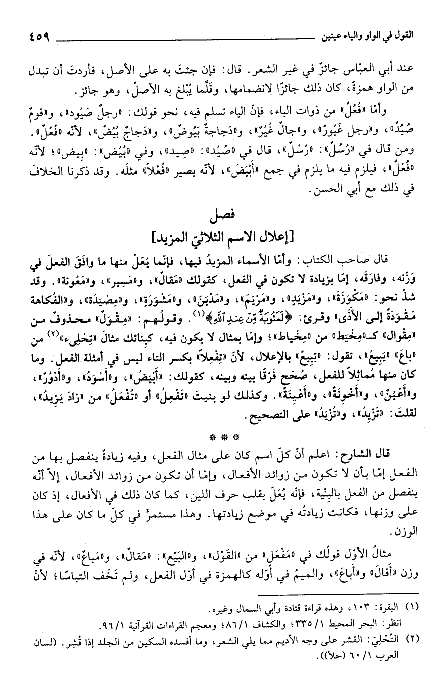 مثالُ الأوّل قولك في "مَفْعَل" من "القَوْل"، و"البيع": "مَقالٌ"، و"مَباعٌ", لأنّه في وزن "أَقالَ" و"أَباعَ"، والميْمُ في أَوّله كالهمزة في أوّل الفعل، ولم تَخَف التباسًا؛ لأنّ