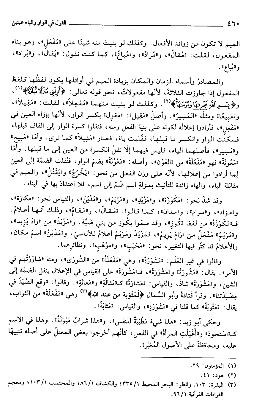 والمصادرُ وأسماء الزمان والمكان بزيادة الميم في أوائلها يكون لفظُها كلفظ المفعول إذا جاوزت الثلاثةَ، لأنّها مفعولاتٌ، نحو قوله تعالى: {أَنْزِلْنِي مُنْزَلًا مُبَارَكًا} (¬1)، و {بِسْمِ اللَّهِ مَجْرَاهَا وَمُرْسَاهَا} (¬2). وكذلك لو بنيت منهما "مَفعِلًا"، لقلت: "مَقِيلًا"، و"مَبِيعًا" ومثلُه "المَسِيرُ". وأصلُ "مَقِيل": "مَقوِل" بكسر الواو، لأنّها بإزاء العين في "مَفْعِلٍ"، فأرادوا إعلالَه لكونه علي بنية الفعل ومنه، فنقلوا كسرة الواو إلى القاف قبلها، فسكنت الواو وانكسر ما قبلها، فقُلبت ياءً، فصار "مَقِيلًا" كما ترى. وأمّا "مَبِيع" و"مَسِير"، فأصلهما الياء، فليس فيهما إلّا نقلُ الكسرة من العين إلى ما قبلها. وأمّا "مَعُونَةٌ" فهو "مَفْعُلَةُ" من "العَوْن"، وأصله: "مَعْوُنَةٌ" بضمّ الواو، فنُقلت الضمّة إلى العين لِما أرادوا من إعلالها, لأنه على وزن الفعل من نحو: "يَخرُجُ" و"يَقتُلُ"، والميم في مقابَلة الياء، والهاء زائدة للتأنيث بمنزلةِ اسم ضُمّ إلى اسم، فلا اعتدادَ بها في البناء.