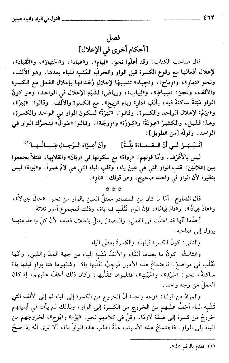 قال الشارح: أمّا ما كان من المصادر معتلَّ العين بالواو من نحو: "حالَ حِيالًا"، و"عاذَ عِياذًا"، و"قامَ قِيامًا"، فإن الواو تُقْلَب فيه ياءً وذلك لمجموعِ أمور ثلاثة: