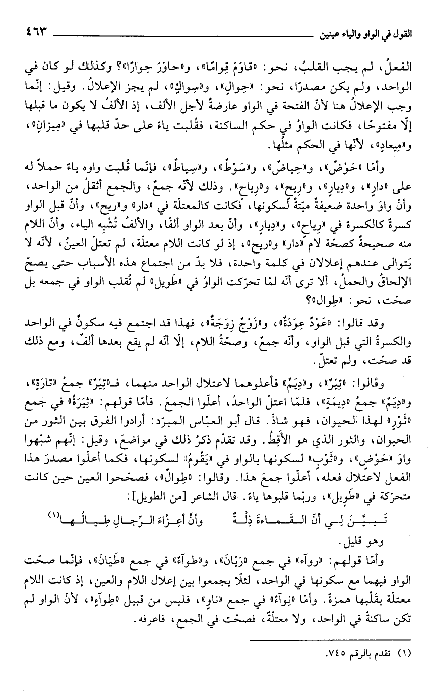 وقالوا: "تِيَرٌ"، و"دِيَمٌ" فأعلوهما لاعتلال الواحد منهما، فـ "تِيَرٌ" جمعُ "تارَةٍ"، و"دِيَمٌ" جمعُ "دِيمَةٍ"، فلمّا اعتلّ الواحدُ، أعلّوا الجمعَ. فأمّا قولهم: "ثِيَرَةٌ" في جمع "ثَوْرٍ" لهذا الحيوان، فهو شاذّ. قال أبو العبّاس، المبرّد: أرادوا الفرق بين الثور من الحيوان، والثور الذي هو الأَقِطُ. وقد تقدّم ذكرُ ذلك في مواضعَ، وقيل: إنّهم شبّهوا واوَ "حَوْضٍ", و"ثَوْبٍ" لسكونها بالواو في "يَقُومُ" لسكونها، فكما أعلّوا مصدرَ هذا الفعل لاعتلال فعله، أعلّوا جمعَ هذا. وقالوا: "طوالٌ"، فصحّحوا العين حين كانت متحرّكة في "طَوِيل", وربما قلبوها ياءً، قال الشاعر [من الطويل]: