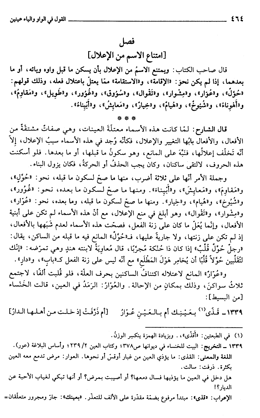 قال صاحب الكتاب: ويمتنع الإسم من الإعلال بأن يسكن ما قبل واوه ويائه, أو ما بعدهما إذا لم يكن نحو الإقامة والاستقامة مما يعتل باعتلال فعله وذلك قولهم حول وعوار ومشوار وتقوال وسووق وغوور وطويل ومقاوم وأهوناء وشيوخ وهيام وخيار ومعايش وأبيناء.