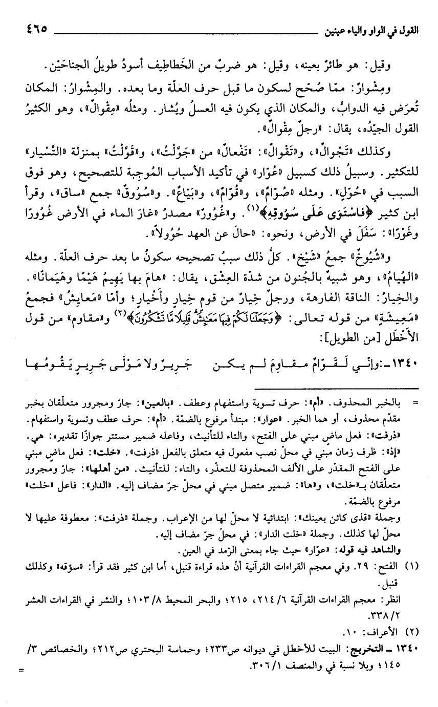 و"شُيُوخٌ" جمعُ "شَيْخ". كل ذلك سببُ تصحيحه سكونُ ما بعد حرف العلّة. ومثله "الهُيامُ"، وهو شبيهٌ بالجُنون من شدّة العِشْق، يقال: "هامَ بها يَهِيمُ هَيْمًا وهَيَمانًا". والخِيارُ: الناقة الفارهة، ورجلٌ خِيارٌ من قومِ خِيارٍ وأَخْيارٍ؛ وأمّا "مَعايِشُ" فجمعُ "مَعِيشَةٍ" من قوله تعالى: {وَجَعَلْنَا لَكُمْ فِيهَا مَعَايِشَ قَلِيلًا مَا تَشْكُرُونَ} (¬2) و"مقاوم" من قول الأَخطَل [من الطويل]: