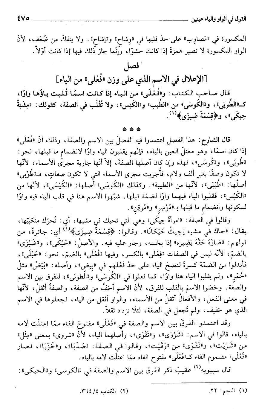 قال الشارح: هذا الفصل اعتمدوا فيه الفصلَ بين الاسم والصفة، وذلك أنّ "فُعْلَى" إذا كان اسمًا، وهو معتلّ العين بالياء، فإنّهم يقلبون الياء واوًا لانضمامِ ما قبلها، نحو: "طُوبَى"، و"كُوسَى"، فهذه وإن كان أصلها الصفةَ، إلّا أنّها جارية مجرى الأسماء، لأنّها لا تكون وصفًا بغير ألف ولام، فأُجريت مجرى الأسماء التى لا تكون صفاتٍ، فـ "طُوْبى" أصلُها: "طُيْبَى", لأنّها من "الطيبة". وكذلك "الكوسَى" أصلها: "الكُيْسَى"، لأنّها من "الكَيْس"، فقلبوا الياء فيهما واوًا لضمّة قبلها. شبّهوا الاسم هنا في قلب الياء فيه واوًا لسكونها وانضمامِ ما قبلها بـ"مُوْسِرٍ" و"مُوقِنٍ".