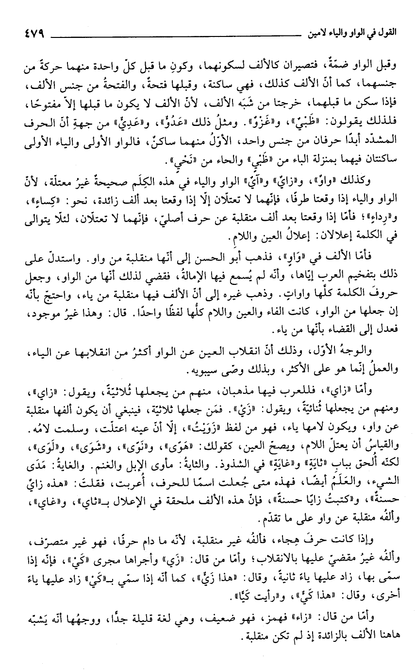 وقبل الواو ضمّةٌ، فتصيران كالألف لسكونهما، وكونِ ما قبل كلّ واحدة منهما حركةً من جنسهما، كما أنّ الألف كذلك، فهي ساكنة، وقبلها فتحةٌ، والفتحةُ من جنس الألف، فإذا سكن ما قبلهما، خرجتا من شَبَه الألف, لأنّ الألف لا يكون ما قبلها إلّا مفتوحًا، فلذلك يقولون: "ظَبْيٌ"، و"عزْوٌ". ومثلُ ذلك "عَدُوٌّ"، و"عَدِيٌّ" من جهةِ أنّ الحرف المشدّد أبدًا حرفان من جنس واحد، الأوَّلُ منهما ساكنٌ، فالواو الأولى والياء الأولى ساكنتان فيهما بمنزلة الباء من "ظَبْيٍ" والحاء من "نَحْيٍ".