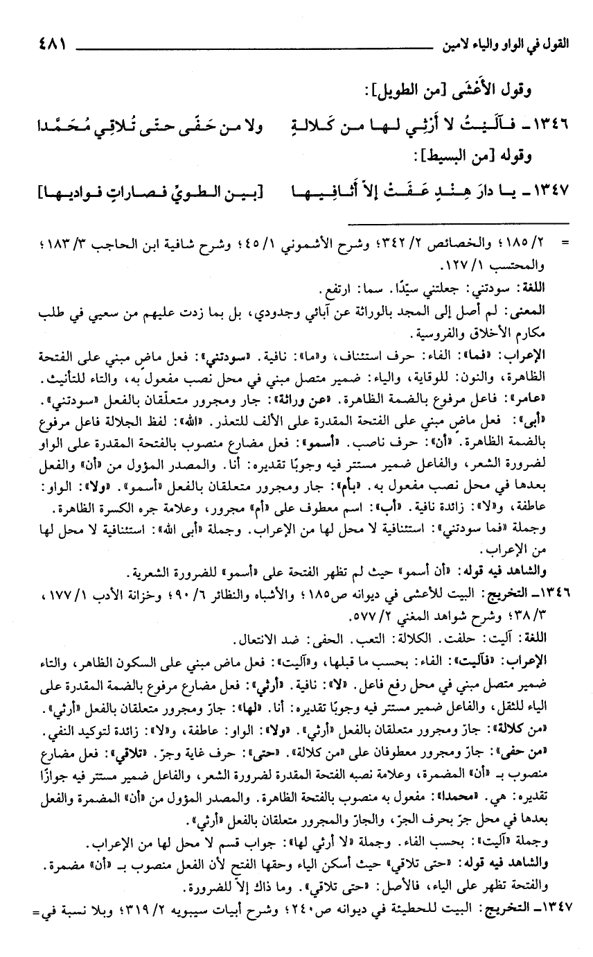 1346 - التخريج: البيت للأعشى في ديوانه ص 185؛ والأشباه والنظائر 6/ 90؛ وخزانة الأدب 1/ 177، 3/ 38؛ وشرح شواهد المغني 2/ 577.