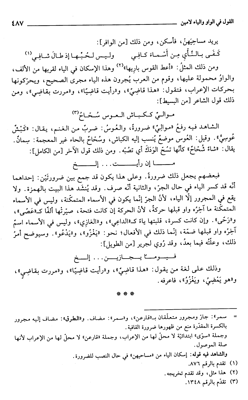 فبعضهم يجعل ذلك ضرورةً. وعلى هذا يكون قد جمع بين ضرورتَيْن: إحداهما أنّه قد كسر الياء في حال الجرّ، والثانية أنّه صرف. وقد ينشَد هذا البيت بالهمزة. ولا يقع في المجرور إلّا الياء, لأنّ الجرّ إنّما يكون في الأسماء المتمكنة، وليس في الأسماء المتمكّنة ما آخِرُه واو قبلها حركةٌ, لأنّ الحركة إن كانت فتحة، صيّرتْها ألفًا كـ"عَصًى"، و"رَحًى". وإن كانت كسرة، قلبتها ياءً كـ"الداعِي"، و"الغازي"، وليس في الأسماء اسمٌ آخِرُه واو قبلها ضمّة، إنّما ذلك في الأفعال؛ نحو: "يَغْزُو"، و"يَدْعُو". وسيوضح أمرُ ذلك، وعلّتُه فيما بعدُ، وقد رُوي لجرير [من الطويل]: