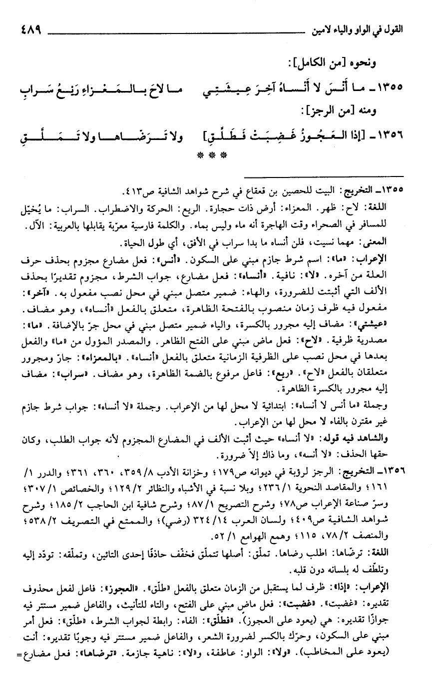 1356 - التخريج: الرجز لرؤبة في ديوانه ص 179؛ وخزانة الأدب 8/ 359، 360، 361؛ والدرر 1/ 161؛ والمقاصد النحوية 1/ 236؛ وبلا نسبة في الأشباه والنظائر 2/ 129؛ والخصائص 1/ 307؛ وسرّ صناعة الإعراب ص 78؛ وشرح التصويح 1/ 87؛ وشرح شافية ابن الحاجب 2/ 185؛ وشرح شواهد الشافية ص 409؛ ولسان العرب 14/ 324 (رضي)؛ والممتع في التصريف 2/ 538؛ والمنصف 2/ 78, 115؛ وهمع الهوامع 1/ 52.