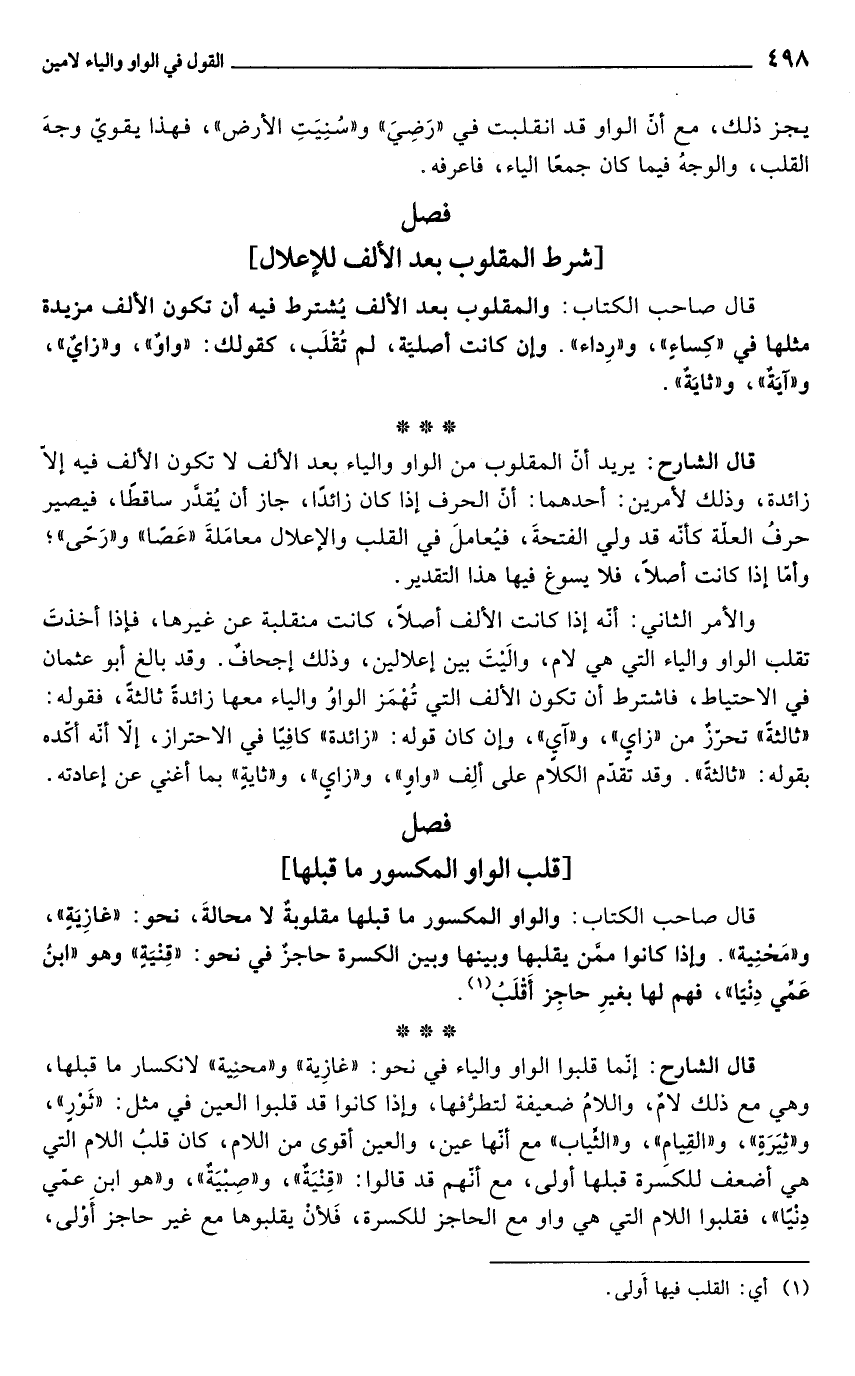 قال الشارح: إنّما قلبوا الواو والياء في نحو: "غازِية" و"محنِية" لانكسار ما قبلها، وهي مع ذلك لامٌ، واللامُ ضعيفة لتطرُّفها، وإذا كانوا قد قلبوا العين في مثل: "ثَوْرٍ"، و"ثِيَرَةٍ"، و"القِيامِ"، و"الثِّياب" مع أنّها عين، والعين أقوى من اللام، كان قلبُ اللام التي هي أضعف للكسرة قبلها أولى، مع أنّهم قد قالوا: "قِنْيَةٌ"، و"صِبْيَةٌ"، و"هو ابن عمي دِنْيًا"، فقلبوا اللام التي هي واو مع الحاجز للكسرة، فَلأنْ يقلبوها مع غير حاجز أَوْلى،
