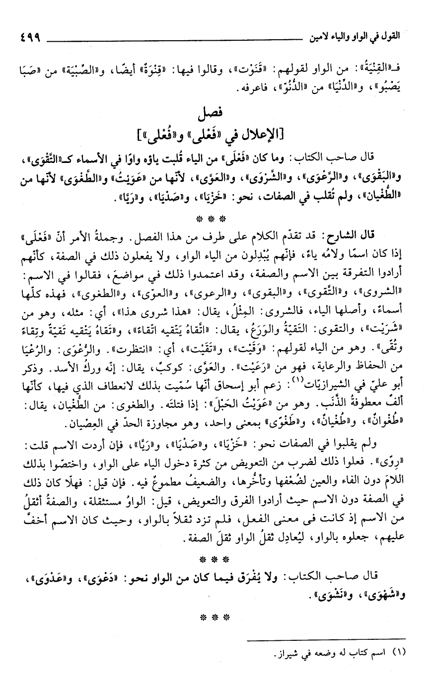 قال الشارح: قد تقدّم الكلام على طرف من هذا الفصل. وجملةُ الأمر أنّ "فَعْلَى" إذا كان اسمًا ولامُه ياءٌ، فإنّهم يُبْدِلون من الياء الواو، ولا يفعلون ذلك في الصفة، كأنّهم أرادوا التفرقة بين الاسم والصفة، وقد اعتمدوا ذلك في مواضعَ، فقالوا في الاسم: "الشروى"، و"التَّقوى"، و"البقوى"، و"الرعوى"، و"العوّى"، و"الطغوى"، فهذه كلّها أسماءٌ، وأصلها الياء، فالشروى: المِثْلُ، يقال: "هذا شروى هذا"، أي: مثله، وهو من "شَرَيْت"، والتقوى: التَقيّةُ والوَرَعُ، يقال: "اتَّقاهُ يَتّقيه اتّقاءً"، و"تَقاهُ يَتْقيه تَقيّةً وتِقاءً وتُقًى". وهو من الياء لقولهم: "وَقَيْت"، و"تَقَيْت"، أي: "انتظرت". والرُّعْوَى: والرُعْيَا من الحفاظ والرعاية، فهو من "رَعَيْت". والعَوَّى: كوكبٌ، يقال: إنّه وركُ الأسد. وذكر أبو عليّ في الشيرازيّات (¬1): زعم أبو إسحاق أنّها سُمّيت بذلك لانعطاف الذي فيها، كأنّها ألفٌ معطوفةُ الذَّنَب. وهو من "عَوَيْتُ الحَبْلَ": إذا فتلتَه. والطغوى: من الطُّغْيان، يقال: "طُغْوانٌ"، و"طُغْيانٌ"، و"طَغْوًى" بمعنى واحد، وهو مجاوزة الحدّ في العِصْيان.
