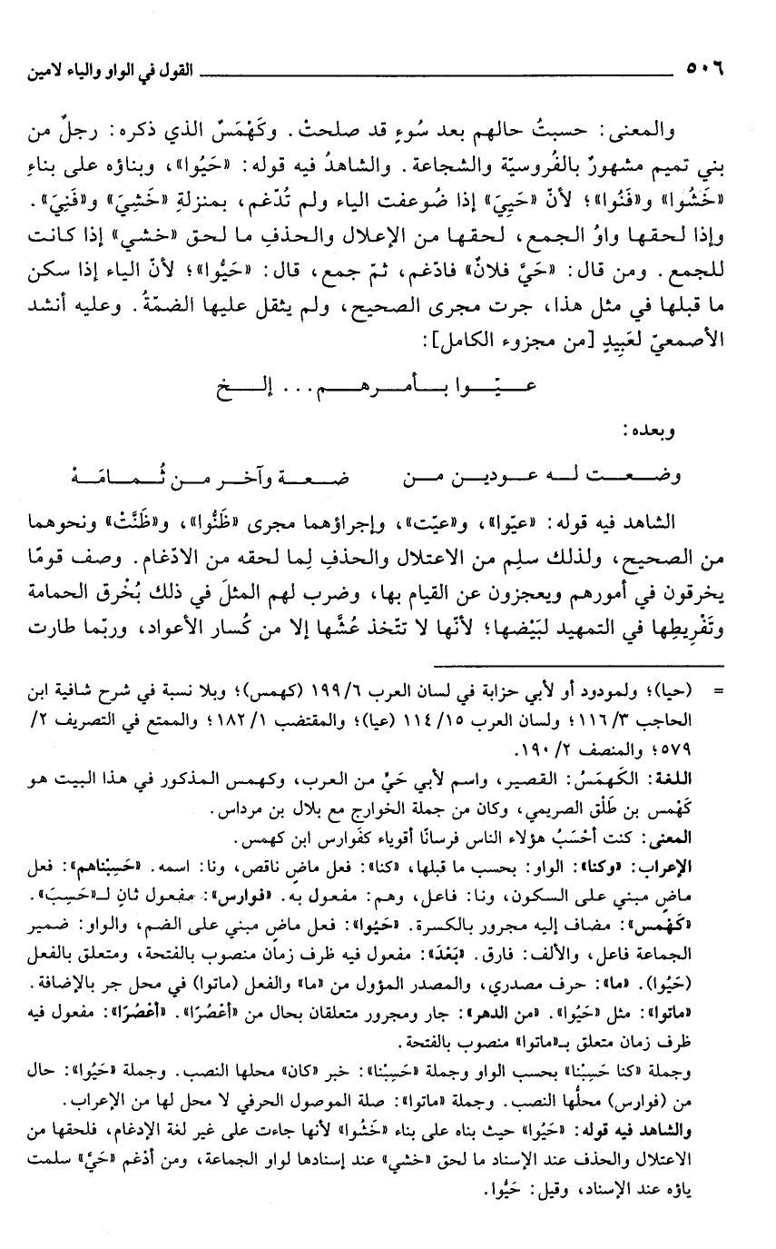 والشاهد فيه قوله: "حَيُوا" حيث بناه علي بناء "خشُوا" لأنها جاءت على غير لغة الإدغام، فلحقها من الاعتلال والحذف عند الإسناد ما لحق "خشي" عند إسنادها لواو الجماعة، ومن أدْغم "حَيَّ" سلمت ياؤه عند الإسناد، وقيل: حَيُّوا.