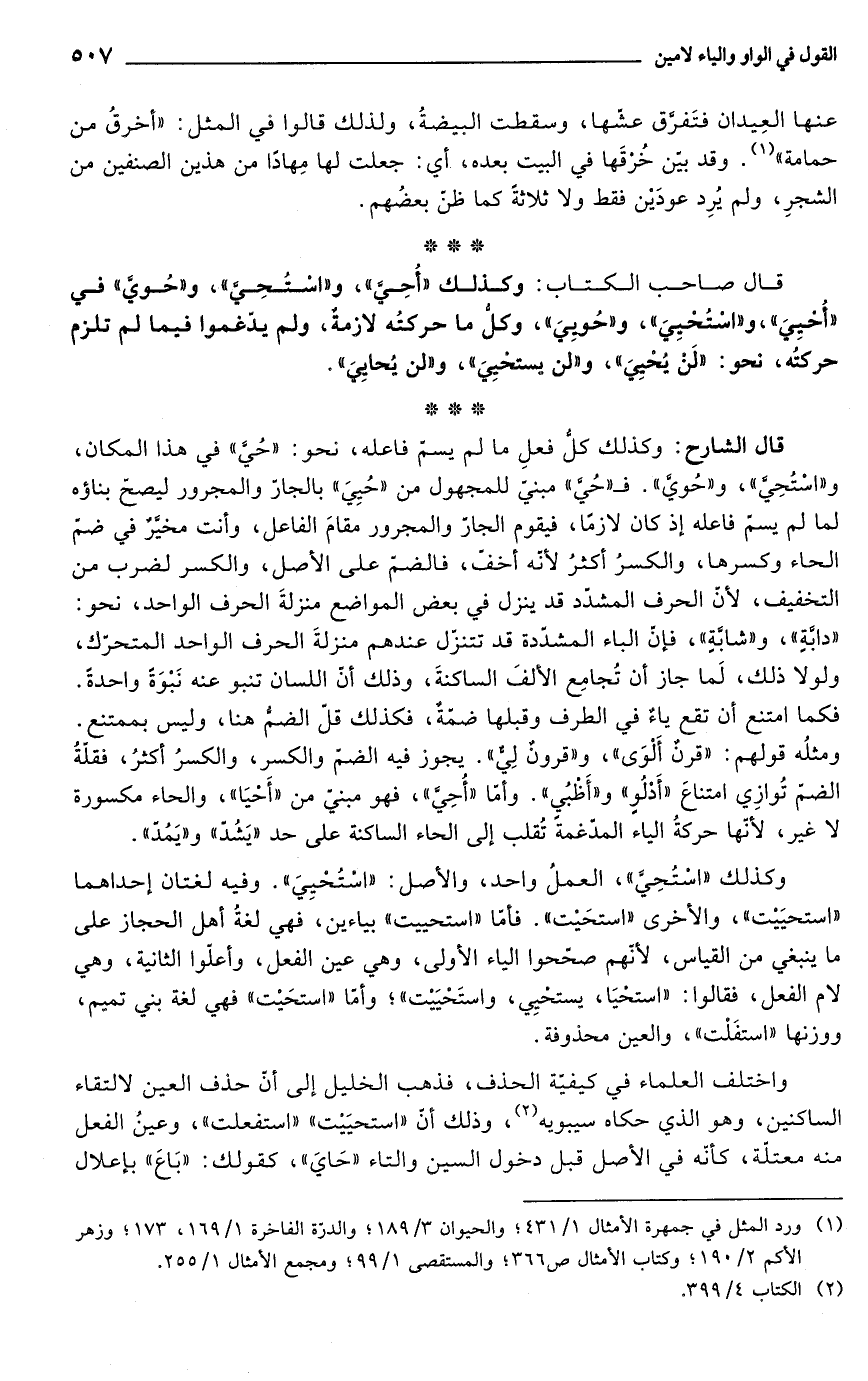 وكذلك "اسْتُحِيَّ"، العملُ واحد، والأصل: "اسْتُحْيِيَ". وفيه لغتان إحداهما "استحيَيْت"، والأخرى "استحَيْت". فأمّا "استحييت" بياءين، فهي لغةُ أهل الحجاز على ما ينبغي من القياس, لأنّهم صحّحوا الياء الأولى، وهي عين الفعل، وأعلّوا الثانية، وهي لام الفعل، فقالوا: "استحْيَا، يستحْيِي، واستَحْيَيْت"؛ وأمّا "استحَيْت" فهي لغة بني تميم، ووزنها "استفَلْت" والعين محذوفة.