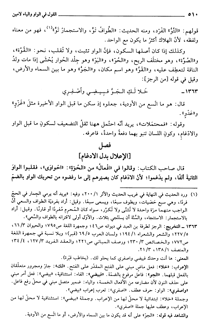 وكذلك إذا كان أصلها السكون، فإن الواو تثبت، ولا تُقلب، نحو: "القُوة"، و"الصُوَّة"، وهو مختلَف الريح، و"الحُوّ"، و"البَوّ" وهو جِلْد الحُوار يُحشَى إذا مات ولدُ الناقة لتعطِف عليه، و"القَوُّ" وهو اسم مكان، و"الجَوُّ" وهو ما بين السماء والأرض، وقيل في قوله [من الرجز]: