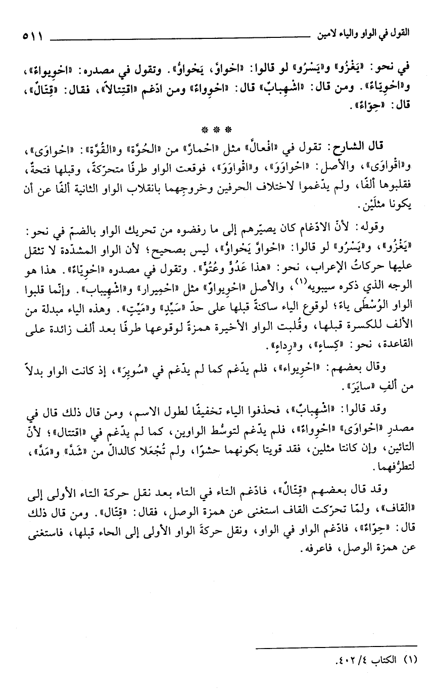 في نحو: "يَغْزُو" و"يَسْرُو" لو قالوا: "احْواوَّ، يَحواوُّ". وتقول في مصدره: "احْوِيواءٌ"، و"احْوِياءٌ". ومن قال: "اشْهِبابٌ" قال: "احْوِواءٌ"، ومن ادّغم "اقتِتالًا"، فقال: "قِتالٌ"، قال: "حِوّاءٌ".