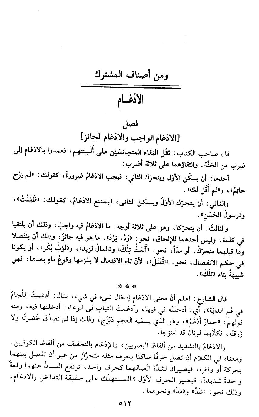 والثاني: أن يتحرك الأول ويسكن الثاني, فيمتنع الادّغام, كقولك: "ظَلِلْتُ", و"رسولُ الحَسَنِ". والثالث: أن يتحركا, وهو على ثلاثة أوجه: ما الادّغام فيه واجبٌ, وذلك أن يلتقيا في كلمة, وليس أحدهما للإلحاق, نحو: "رَدَّ, يَرُدَّ". ما هو جائزٌ, وذلك أن ينفصلا وما قبلهما متحرك أو مدة نحو: "أنعت تلك" والمال لزيد"، و"ثوب بكر"، أو يكونا في حكم الانفصال, نحو: "اقتتل", لأن تاء الافتعال لا يلزمها وقوع تاء بعدها فهي شبيهة بتاء "تلك".