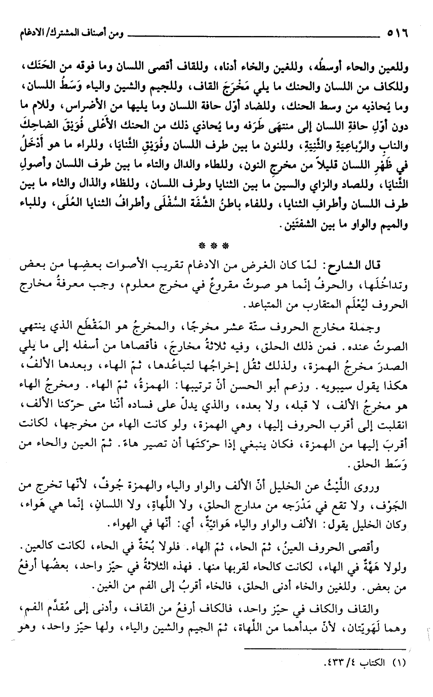 قال الشارح: لمّا كان الغرض من الادغام تقريب الأصوات بعضها من بعض وتداخُلَها، والحرفُ إنّما هو صوتٌ مقروعٌ في مخرج معلوم، وجب معرفةُ مخارج الحروف ليُعْلَم المتقارب من المتباعد.