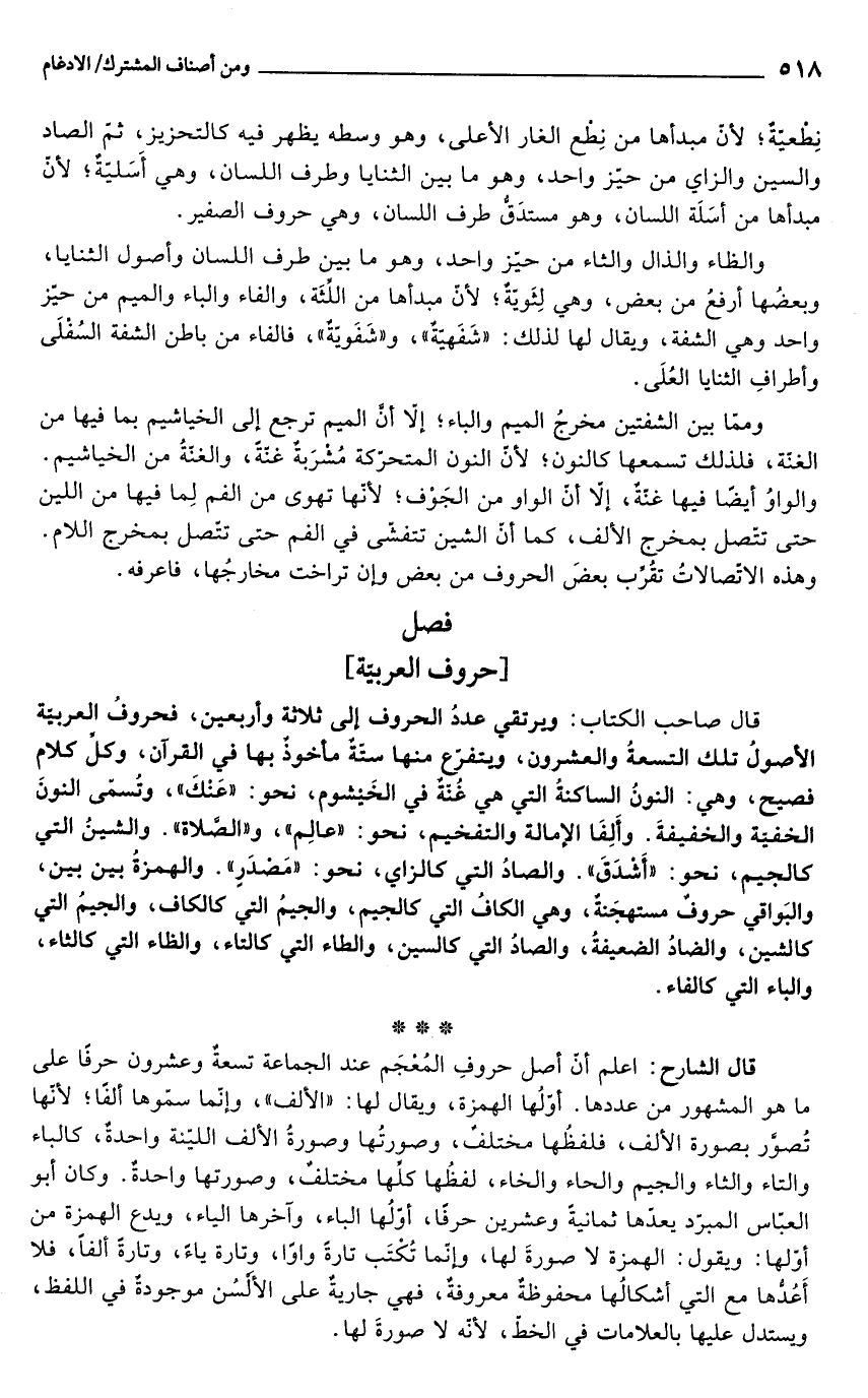 قال الشارح: اعلم أنّ أصل حروفِ المُعْجَم عند الجماعة تسعةٌ وعشرون حرفًا على ما هو المشهور من عددها. أوّلها الهمزة، ويقال لها: "الألف"، وإنّما سمّوها ألفُا؛ لأنّها تُصوَّر بصورة الألف، فلفظُها مختلفٌ، وصورتُها وصورةُ الألف الليّنة واحدةٌ، كالباء والتاء والثاء والجيم والحاء والخاء، لفظُها كلِّها مختلفٌ، وصورتها واحدةٌ. وكان أبو العبّاس المبرّد يعدّها ثمانية وعشرين حرفًا، أوّلُها الباء، وآخرها الياء, ويدع الهمزة من أوّلها: ويقول: الهمزة لا صورةَ لها، وإنّما تُكْتَب تارةً واوًا، وتارة ياءً، وتارةً ألفًا، فلا أَعُدُّها مع التي أشكالُها محفوظةٌ معروفةٌ، فهي جاريةٌ على الألْسُن موجودةٌ في اللفظ، ويستدل عليها بالعلامات في الخطّ, لأنّه لا صورةَ لها.