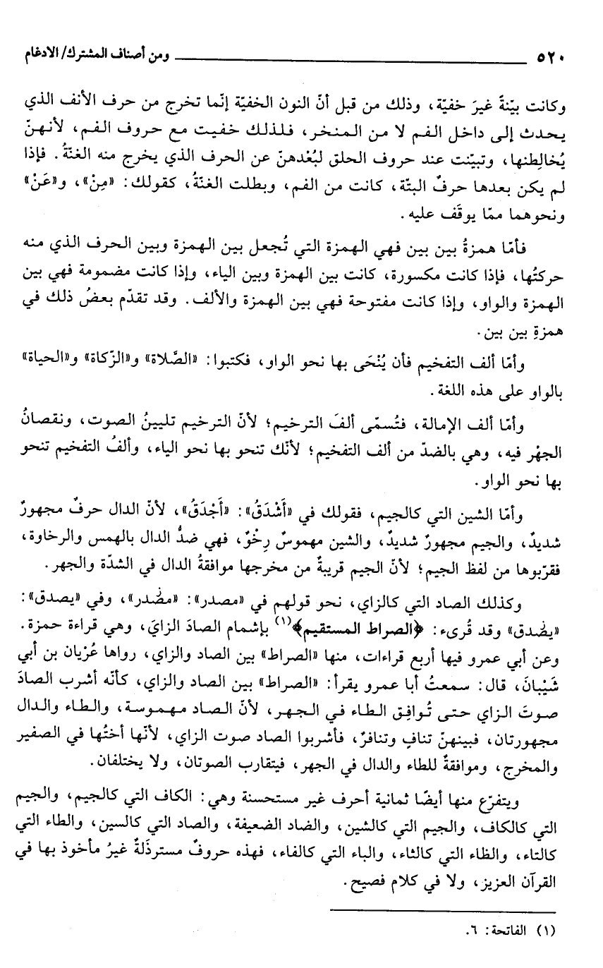 وكذلك الصاد التي كالزاي، نحو قولهم في "مصدر": "مصدر"، وفي "يصدق": "يصدق" وقد قُرىء: {الصِّرَاطَ الْمُسْتَقِيمَ} (¬1) بإشمام الصادَ الزايَ، وهي قراءة حمزة. وعن أبي عمرو فيها أربع قراءات، منها "الصراط" بين الصاد والزاي، رواها عُرْيان بن أبي شَيْبانَ، قال: سمعتُ أبا عمرو يقرأ: "الصراط" بين الصاد والزاي، كأنّه أشرب الصادَ صوتَ الزاي حتى تُوافِق الطاء في الجهر, لأن الصاد مهموسة، والطاء والدال مجهورتان، فبينهنّ تنافٍ وتنافرٌ، فأشربوا الصاد صوت الزاي, لأنّها أختُها في الصفير والمخرج، وموافقةٌ للطاء والدال في الجهر، فيتقارب الصوتان، ولا يختلفان.