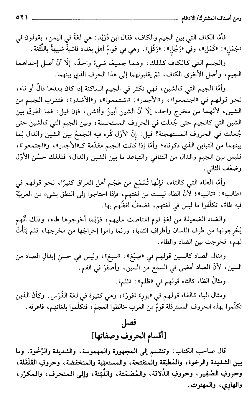وأمّا الجيم التي كالشين، فهي تكثر في الجيم الساكنة إذا كان بعدها دالٌ أو تاء, نحو قولهم في "اجتمعوا"، و"الأجدر": "اشتمعوا"، و"الأشدر"، فتقرب الجيم من الشين, لأنّهما من مخرج واحد، إلَّا أنّ الشين أبينُ وأفشى، فإن قيل: فما الفرق بين الشين التي كالجيم حتى جُعلت في الحروف المستحسنة، وبين الجيم التي كالشين حتى جُعلت في الحروف المستهجنة؟ قيل: إِنّ الأوّل كُره فيه الجمعُ بين الشين والدال لِما بينهما من التباين الذي ذكرناه؛ وأمّا إذا كانت الجيم مقدّمة كـ"الأجدر"، و"اجتمعوا"، فليس بين الجيم والدال من التنافي والتباعد ما بين الشين والدال؛ فلذلك حسُن الأوّل وضعُف الثاني.