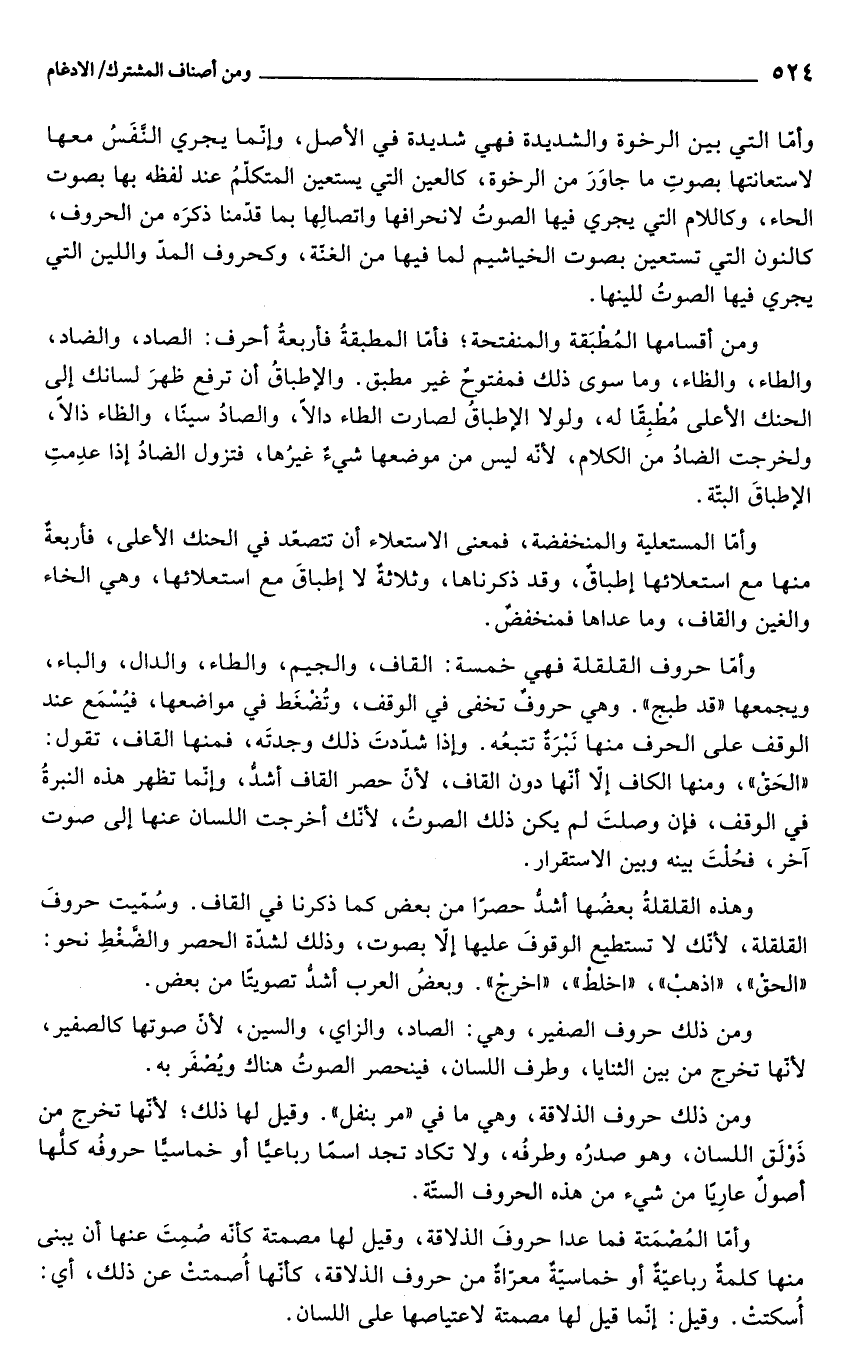 وهذه القلقلةُ بعضُها أشدُّ حصرًا من بعض كما ذكرنا في القاف. وسُمّيت حروفَ القلقلة، لأنّك لا تستطيع الوقوفَ عليها إلا بصوت، وذلك لشدّة الحصر والضَّغْطِ نحو: "الحقْ"، "اذهبْ"، "اخلطْ"، "اخرجْ". وبعضُ العرب أشدُّ تصويتًا من بعض.