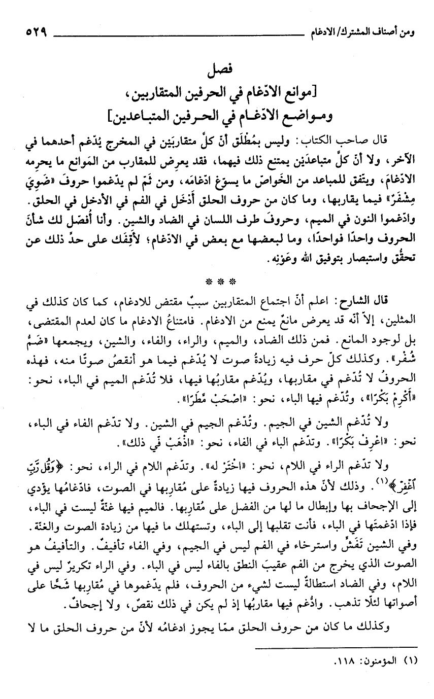 قال الشارح: اعلم أنّ اجتماع المتقاربين سببٌ مقتض للادغام، كما كان كذلك في المثلين، إلّا أنّه قد يعرض مانعٌ يمنع من الادغام. فامتناع الادغام ما كان لعدم المقتضى، بل لوجود المانع. فمن ذلك الضاد، والميم، والراء، والفاء، والشين، ويجمعها "ضَمُّ شُفْر". وكذلك كلّ حرف فيه زيادةُ صوت لا يُدّغم فيما هو أنقصُ صوتًا منه، فهذه الحروفُ لا تُدّغم في مقاربها، ويُدّغم مقاربُها فيها، فلا تُدّغم الميم في الباء، نحو: "أَكرِمْ بَكْرًا"، وتُدّغم فيها الباء، نحو: "اصحَبْ مَّطَرًا".
