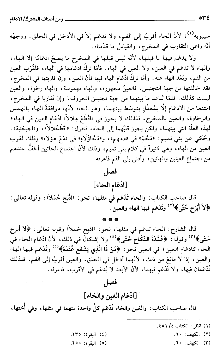 قال الشارح: الحاء تدغم في مثلها، نحو: "اذبح حّملًا" وقوله تعالى: {لَا أَبْرَحُ حَتَّى} (¬3) وقوله: {عُقْدَةَ النِّكَاحِ حَتَّى} (¬4) ولا إشكالَ في ذلك, لأنّ ادِّغام الحاء في الحاء كادغام العين؛ في العين نحو: {مَنْ ذَا الَّذِي يَشْفَعُ عِنْدَهُ} (¬5) وتُدّغم فيها الهاء والعين، إذا لا مانعَ من ذلك, لأنّهما أدخل في الحلق، والعين أقربُ إلى الفم، فلذلك تُدّغمان فيها, ولا تُدّغم فيهما, لأنّ الأبعد لا يُدغم في الأقرب، فاعرفه.
