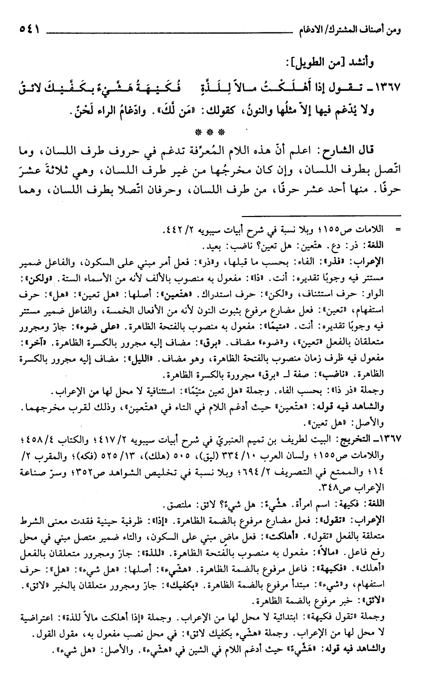 قال الشارح: اعلم أنّ هذه اللام المُعرِّفة تدغم في حروف طرف اللسان، وما اتّصل بطرف اللسان، وإن كان مخرجُها من غير طرف اللسان، وهي ثلاثةَ عشرَ حرفًا. منها أحد عشر حرفًا، من طرف اللسان، وحرفان اتّصلا بطرف اللسان، وهما