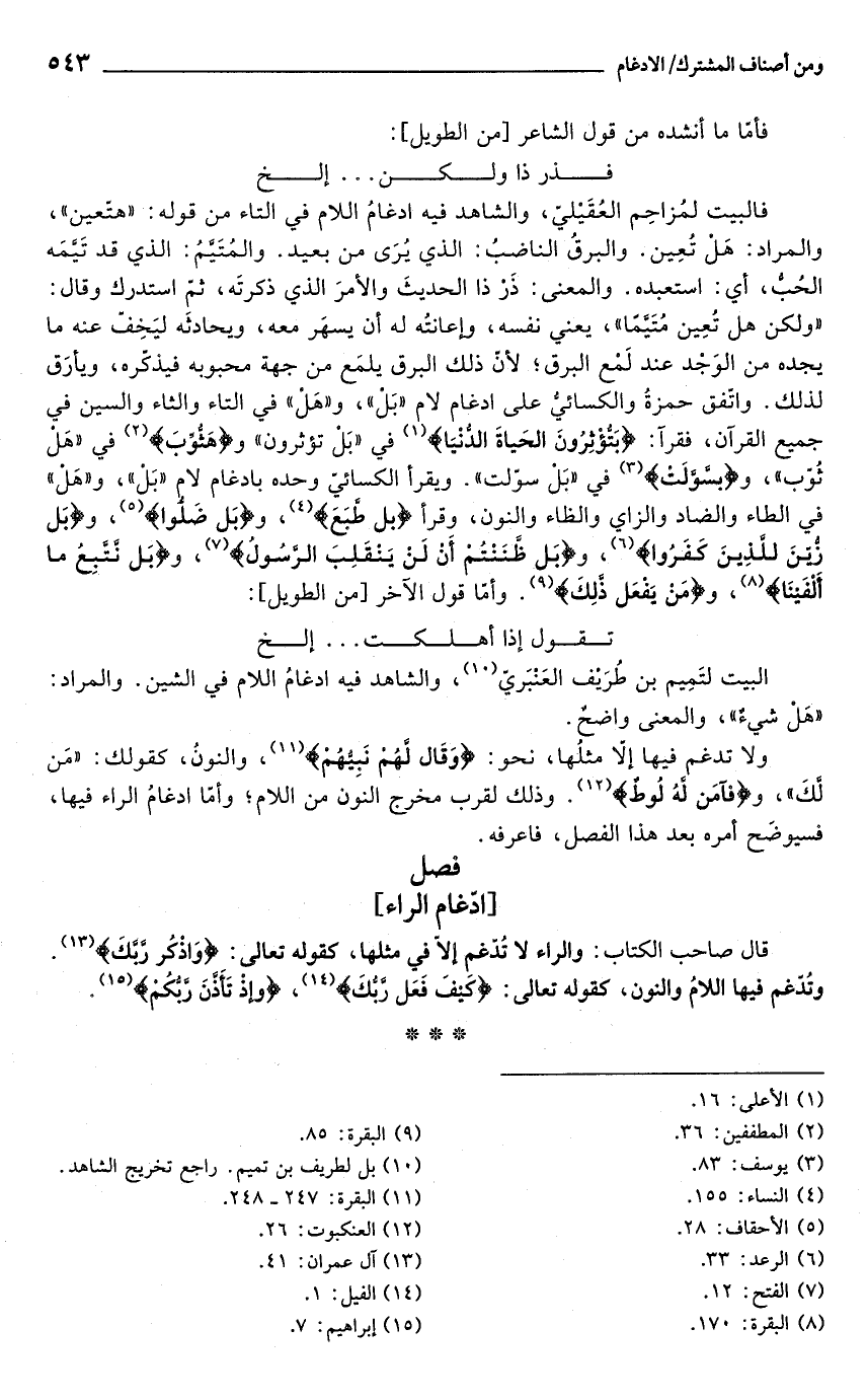 قال صاحب الكتاب: والراء لا تُدّغم إلا في مثلها, كقوله تعالى: {واذكر ربك} (¬13). وتدغم فيها اللام والنون, كقوله تعالى: {كيف فعل ربك} (¬14) , و {إذ تأذن ربكم} (¬15).