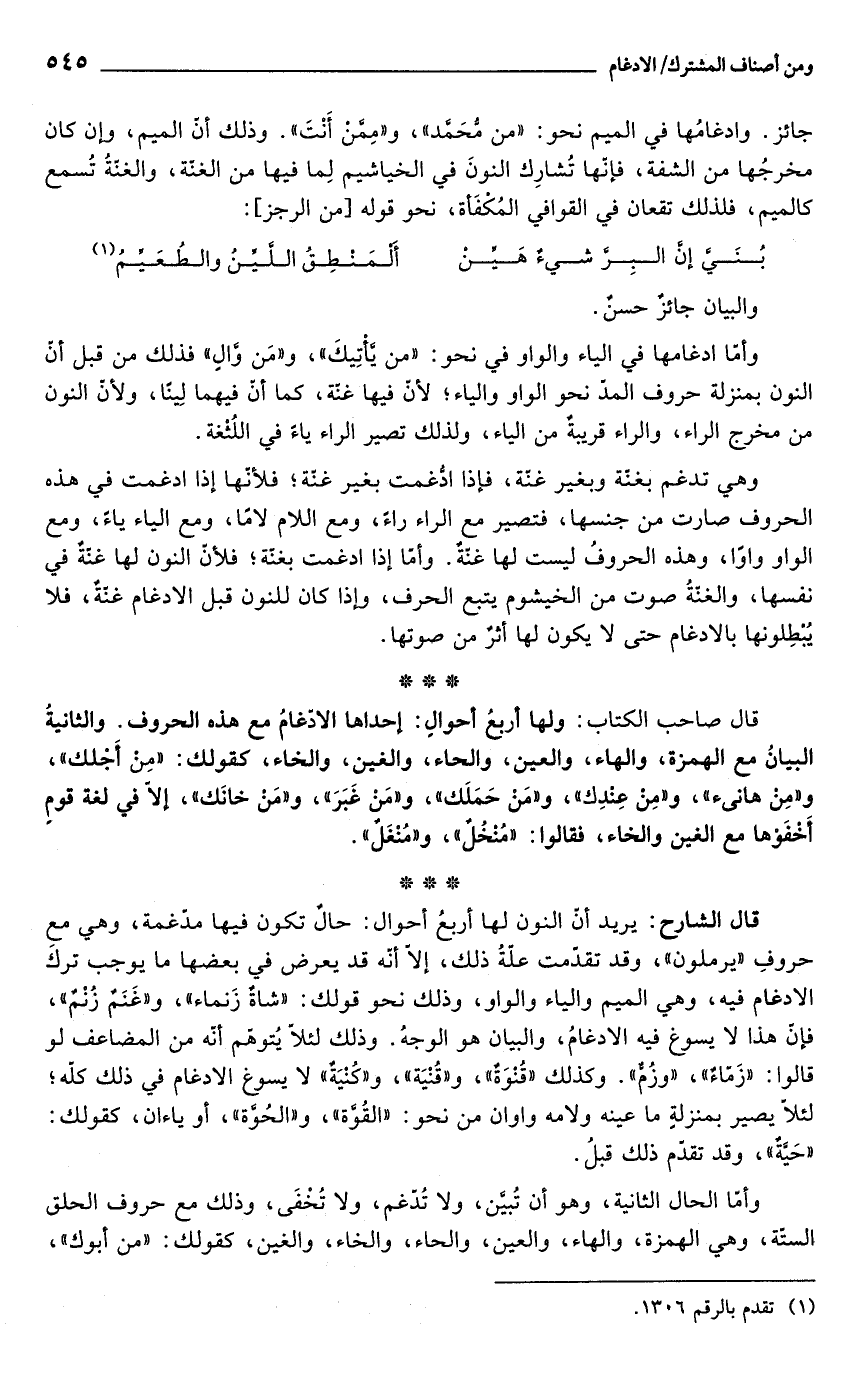 قال الشارح: يريد أنّ النون لها أربعُ أحوال: حالٌ تكون فيها مدّغمة، وهي مع حروفِ "يرملون"، وقد تقدمت علّةُ ذلك، إلّا أنّه قد يعرض في بعضها ما يوجب تركَ الادغام فيه، وهي الميم والياء والواو، وذلك نحو قولك: "شاةٌ زَنماء"، و"غَنَمٌ زُنْمٌ"، فإنّ هذا لا يسوغ فيه الادغامُ، والبيان هو الوجةُ. وذلك لئلّا يُتوهّم أنّه من المضاعف لو قالوا: "زَمّاءٌ"، "وزُمٌّ". وكذلك "قُنوَةٌ"، و"قُنْيَة"، و"كنْيَةٌ" لا يسوغ الادغام في ذلك كلّه؛ لئلّا يصير بمنزلةٍ ما عينه ولامه واوان من نحو: "القُوَّة"، و"الحُوَّة"، أو ياءان، كقولك: "حَيَّةٌ"، وقد تقدّم ذلك قبلُ.
